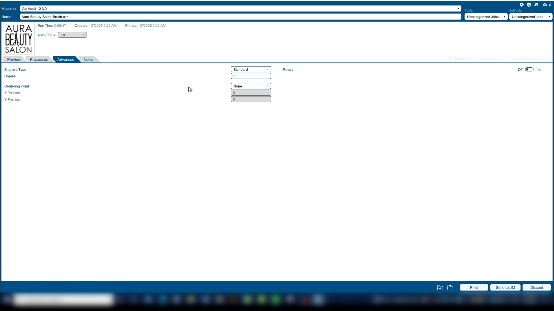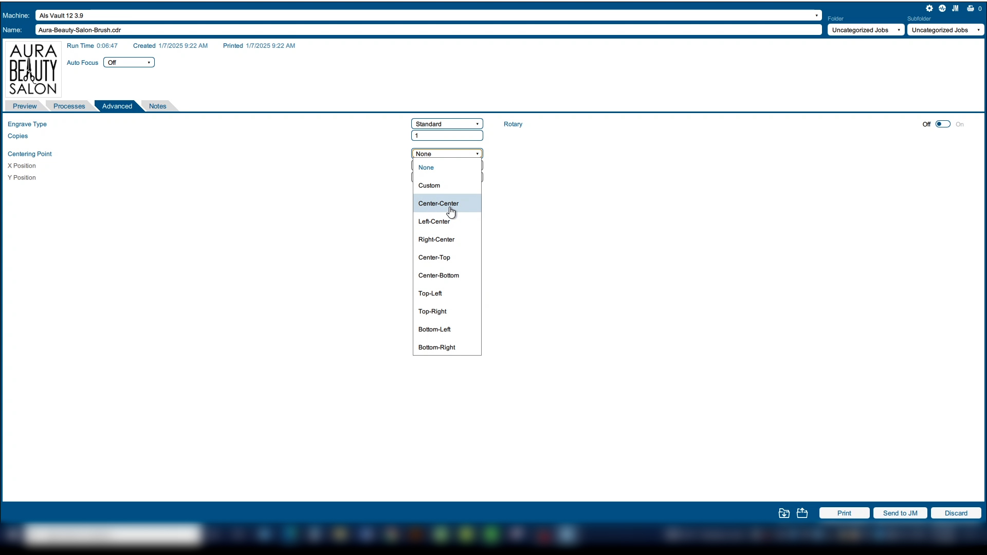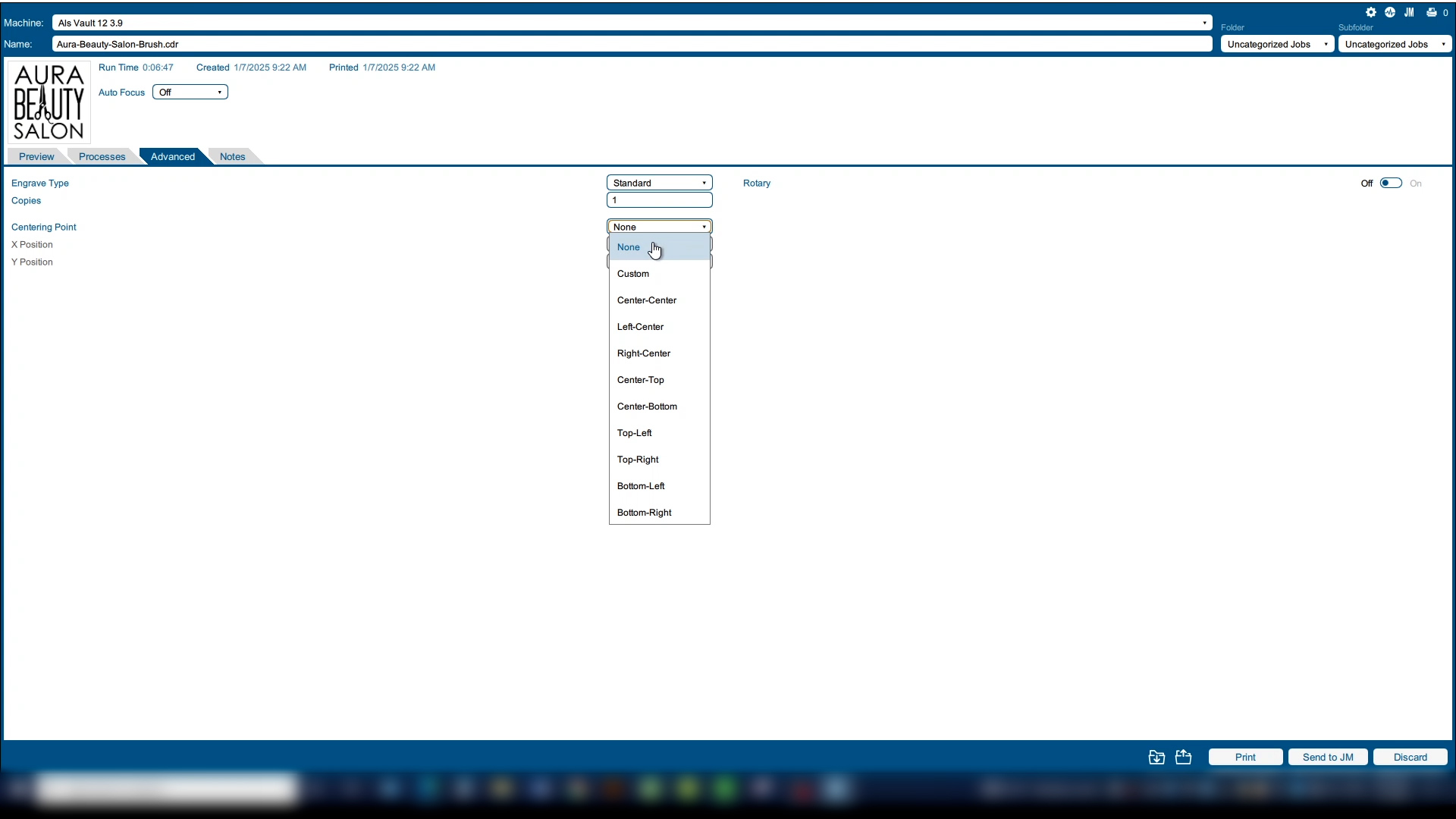 This home position will only apply to jobs sent to the laser with a centering point set in the Laser Dashboard. Any other jobs at the laser will continue to use the top-left corner of the table as the home position.