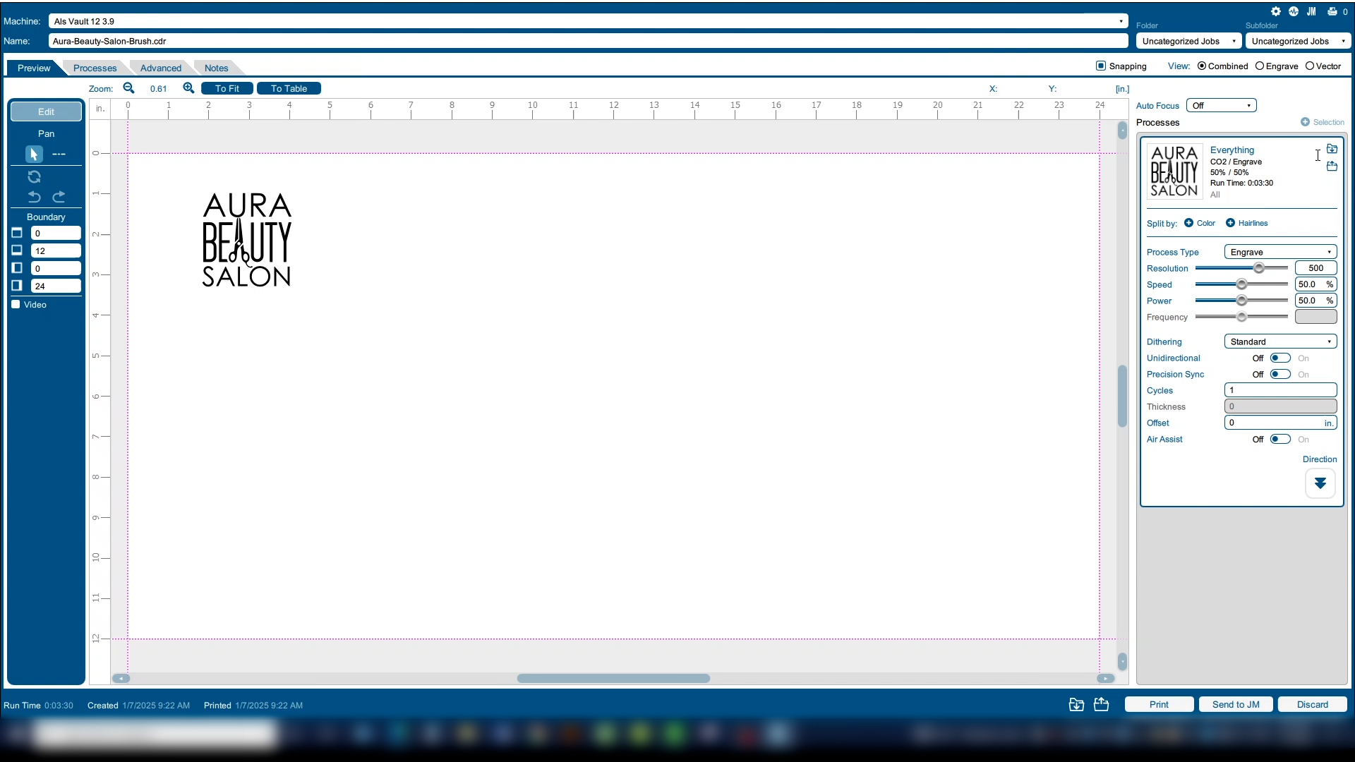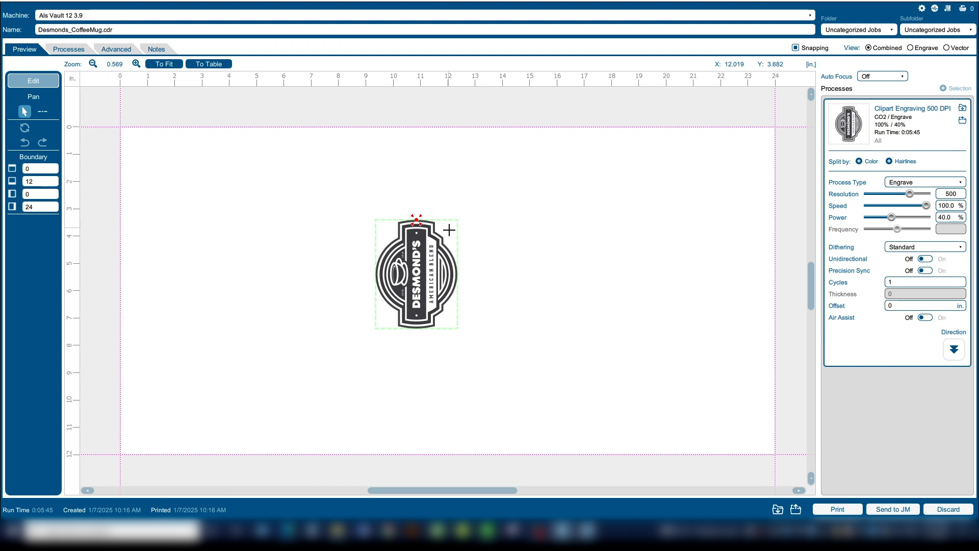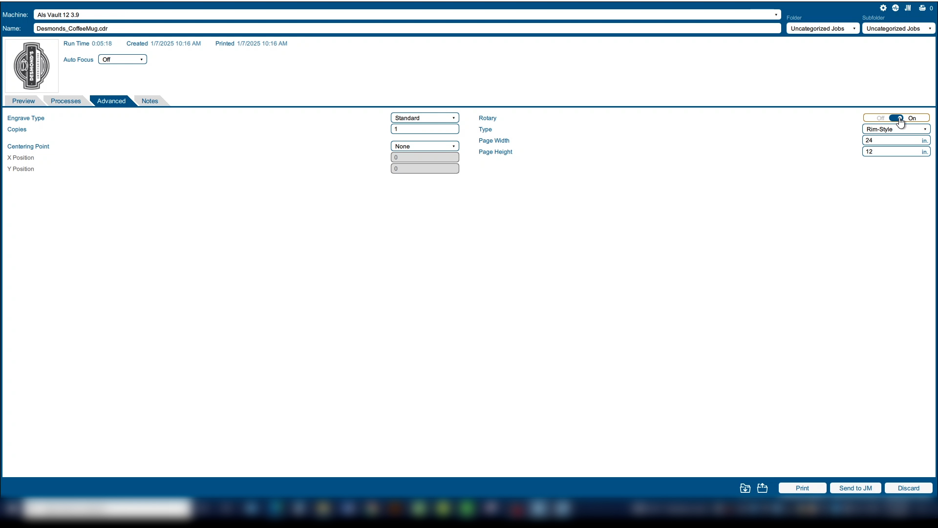This home position will only apply to jobs sent to the laser with a centering point set in the Laser Dashboard. Any other jobs at the laser will continue to use the top-left corner of the table as the home position.