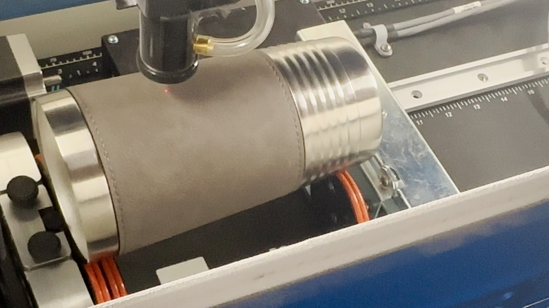 At the laser, position the red dot pointer at the center point of the mug we are engraving.