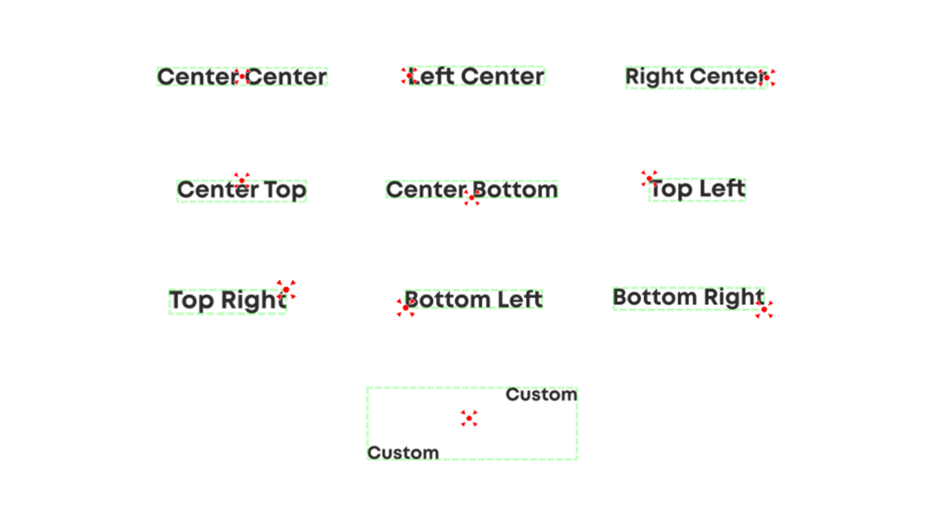 This diagram shows the position for each choice in the drop-down list with the red dot highlighting the centering point. The most common uses are Top-Left and Center-Center.