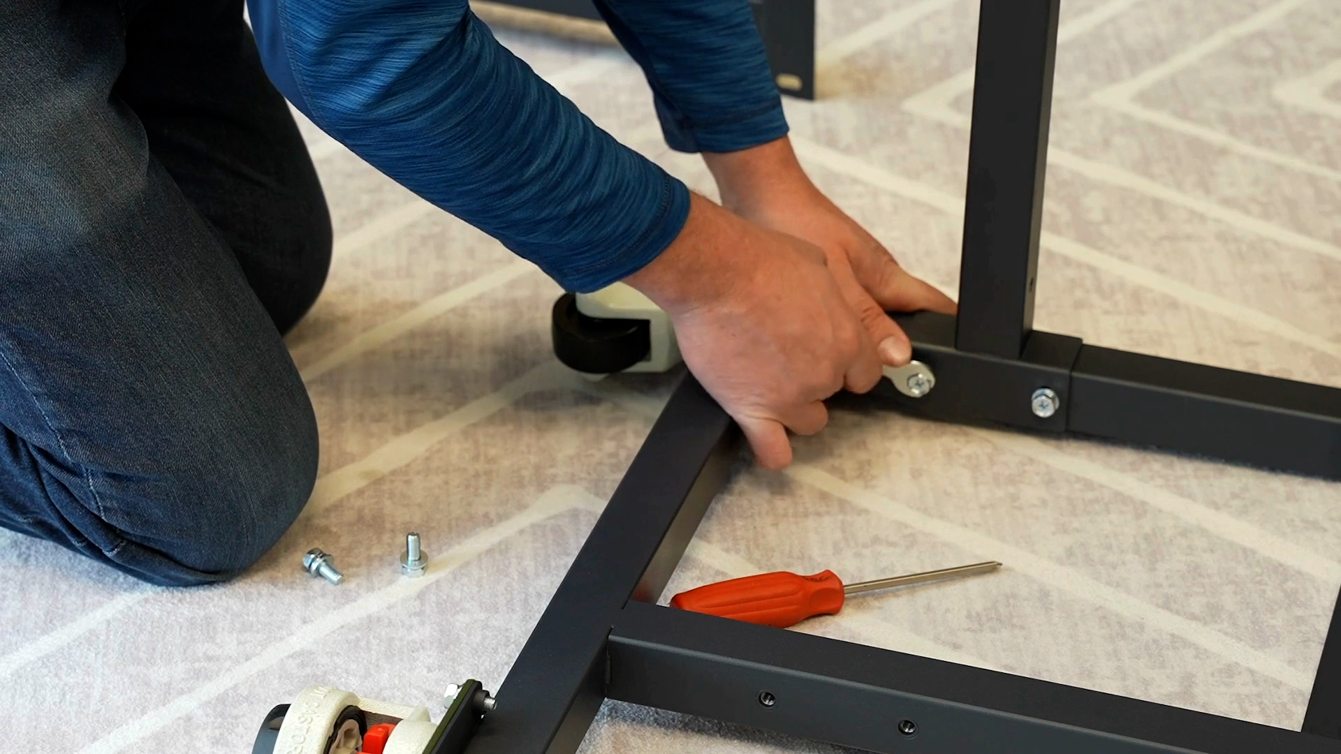 You will have a table stand, 2 cross beams, and two legs. Set one of the legs on the floor or on a table to aid with assembly. Using the Phillips screwdriver with two large screws attach one of the crossbeams to the leg with the crossbeam flat against the bar.