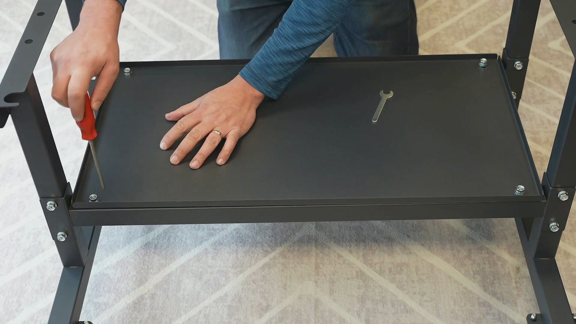 Rotate the stand onto its feet, then attach the accessory shelf to the cross beams using four large screws.