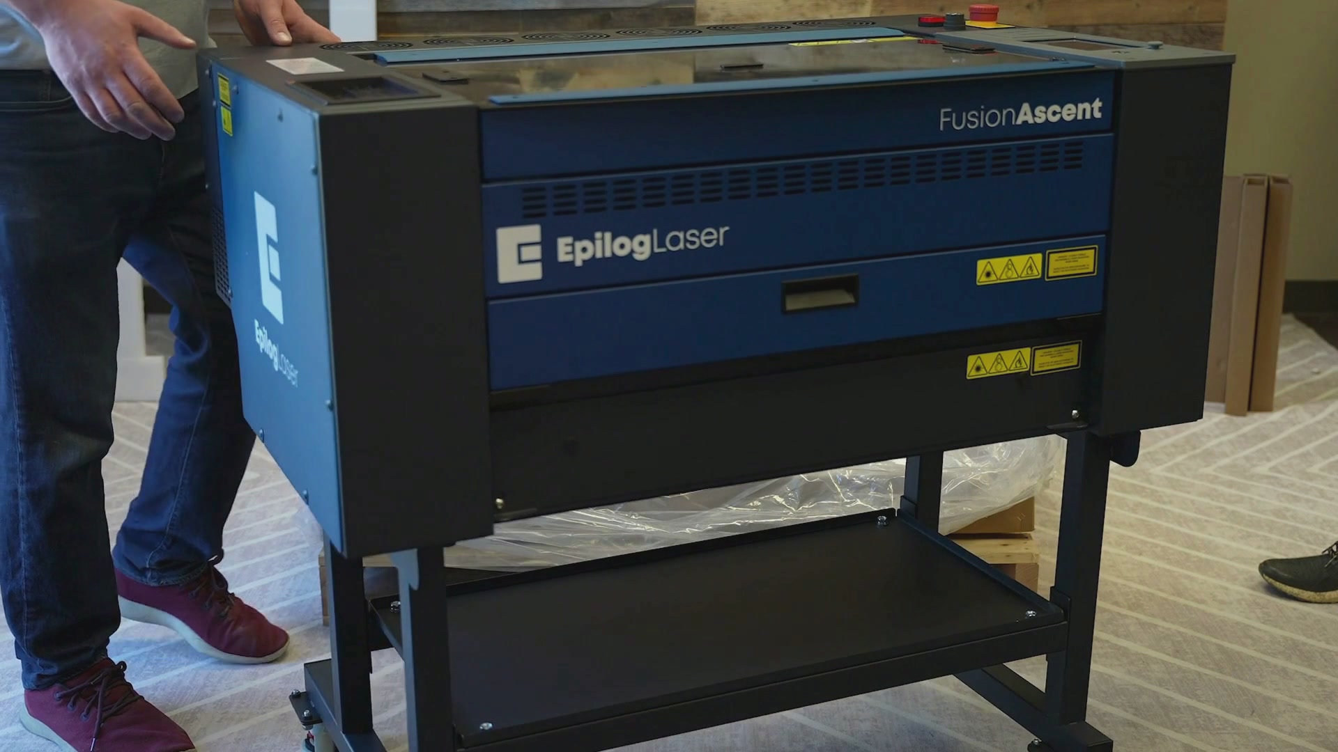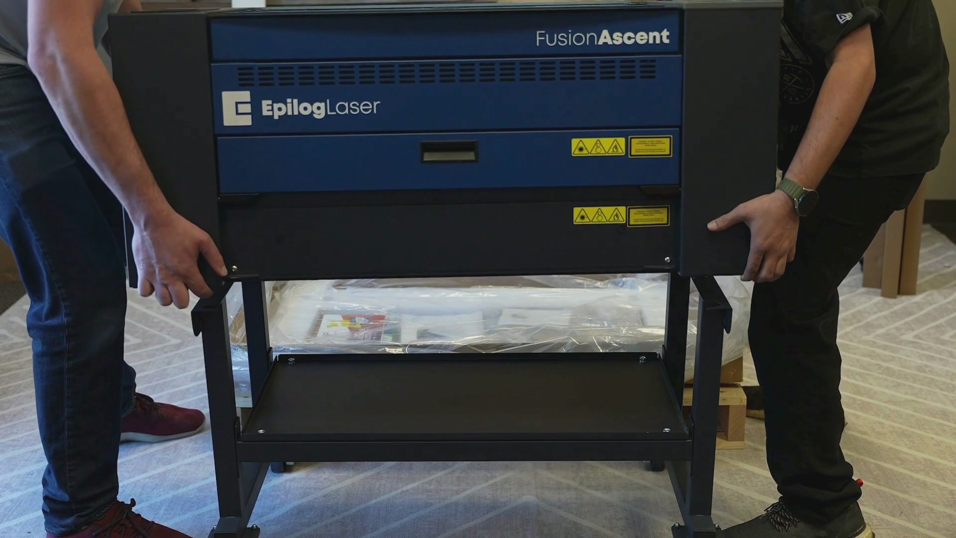 Now the stand is ready to attach to the laser system. With at least two people, carefully lift the machine up and place it onto the stand.