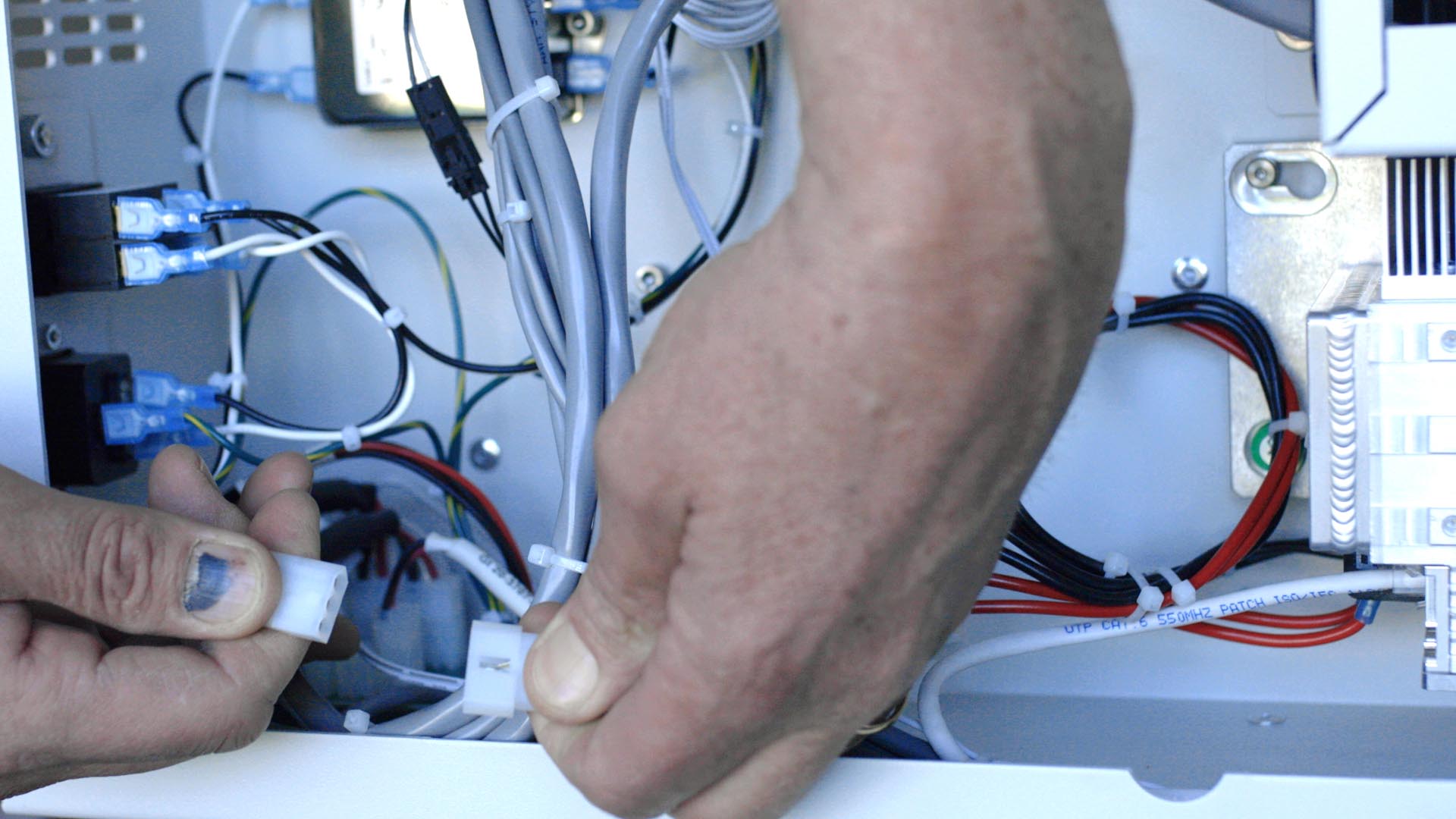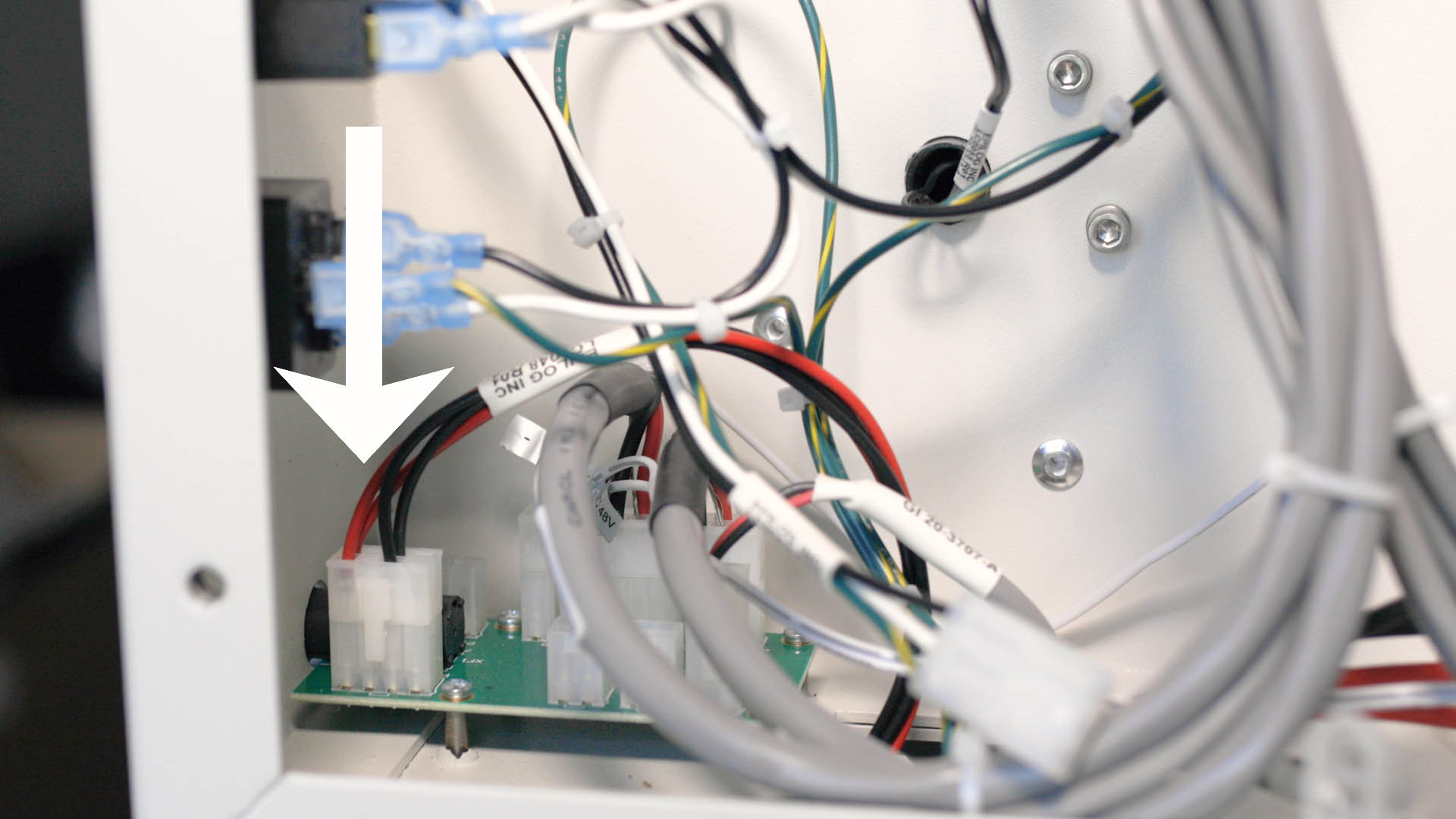 Next, disconnect the electrical connector in the lower left-hand corner of the machine. To remove this connector, press down on the lock and gently pulling the connector from the PCB. DO NOT PULL on the wires, as you could pull them from the connector.