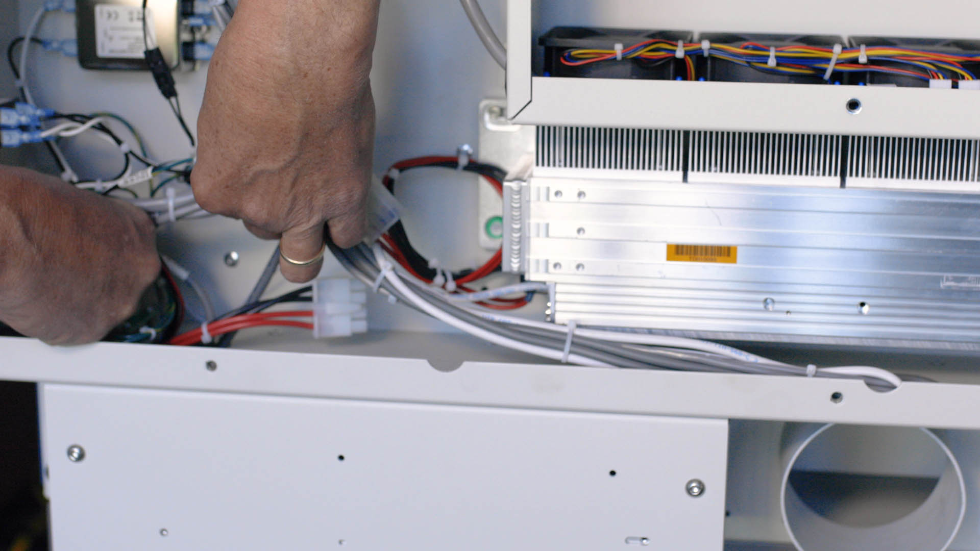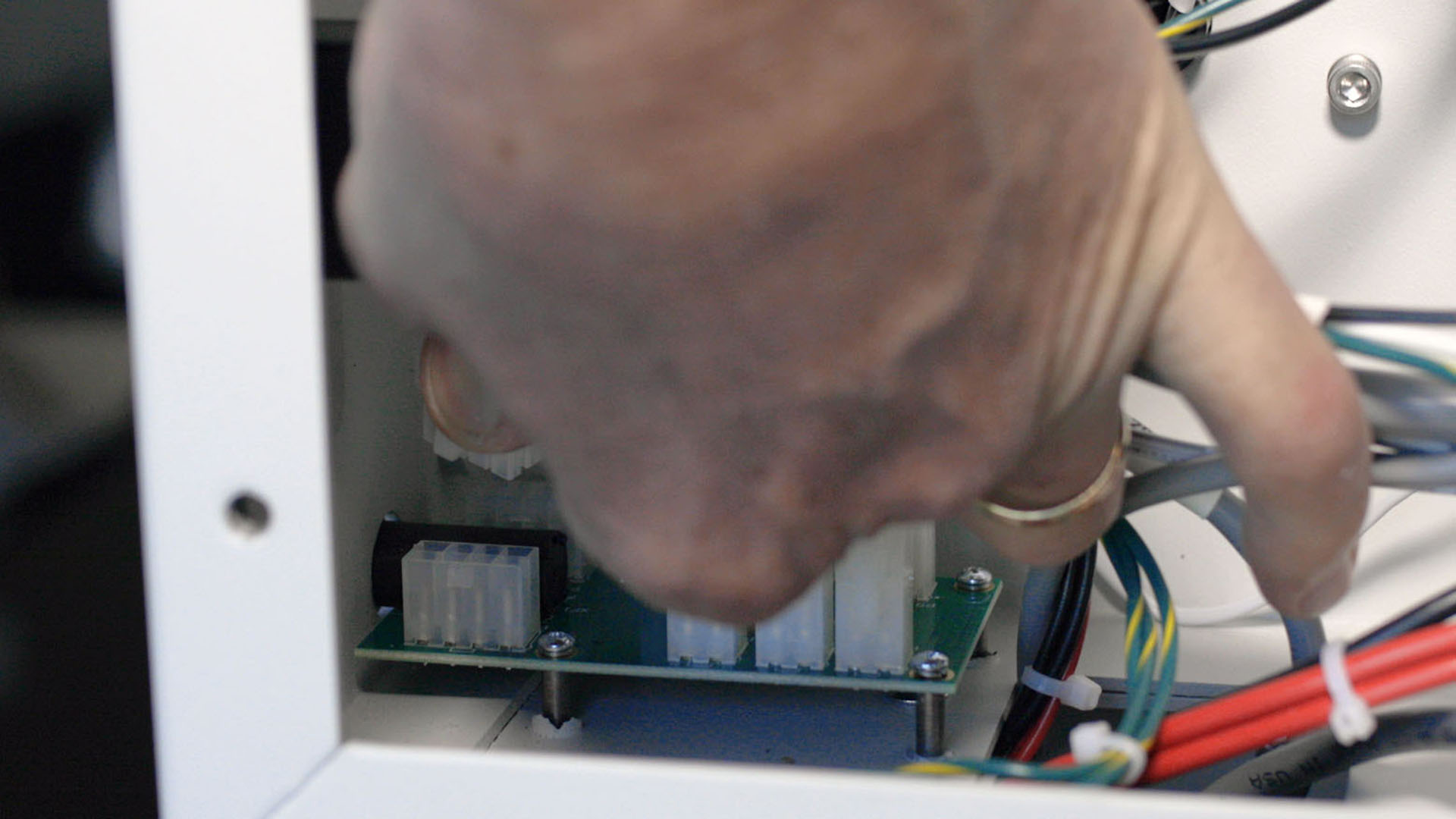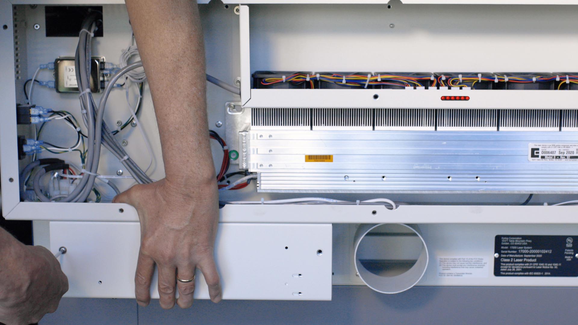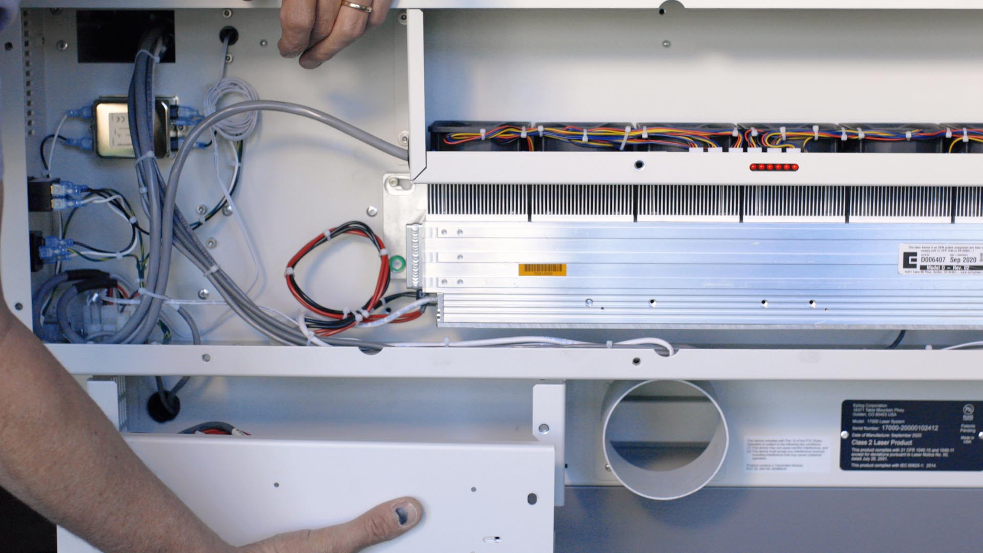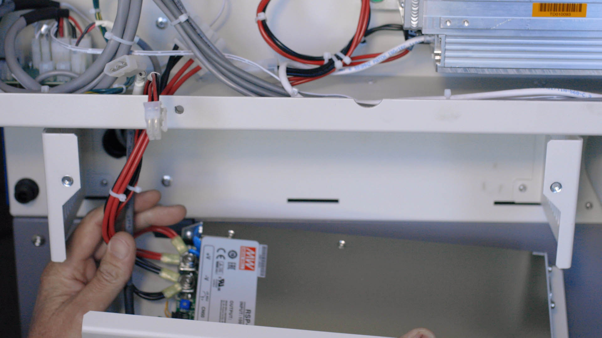 Now that the power supply is secure, you may reconnect the laser power connector, the electrical connector, and the power line filter connector.