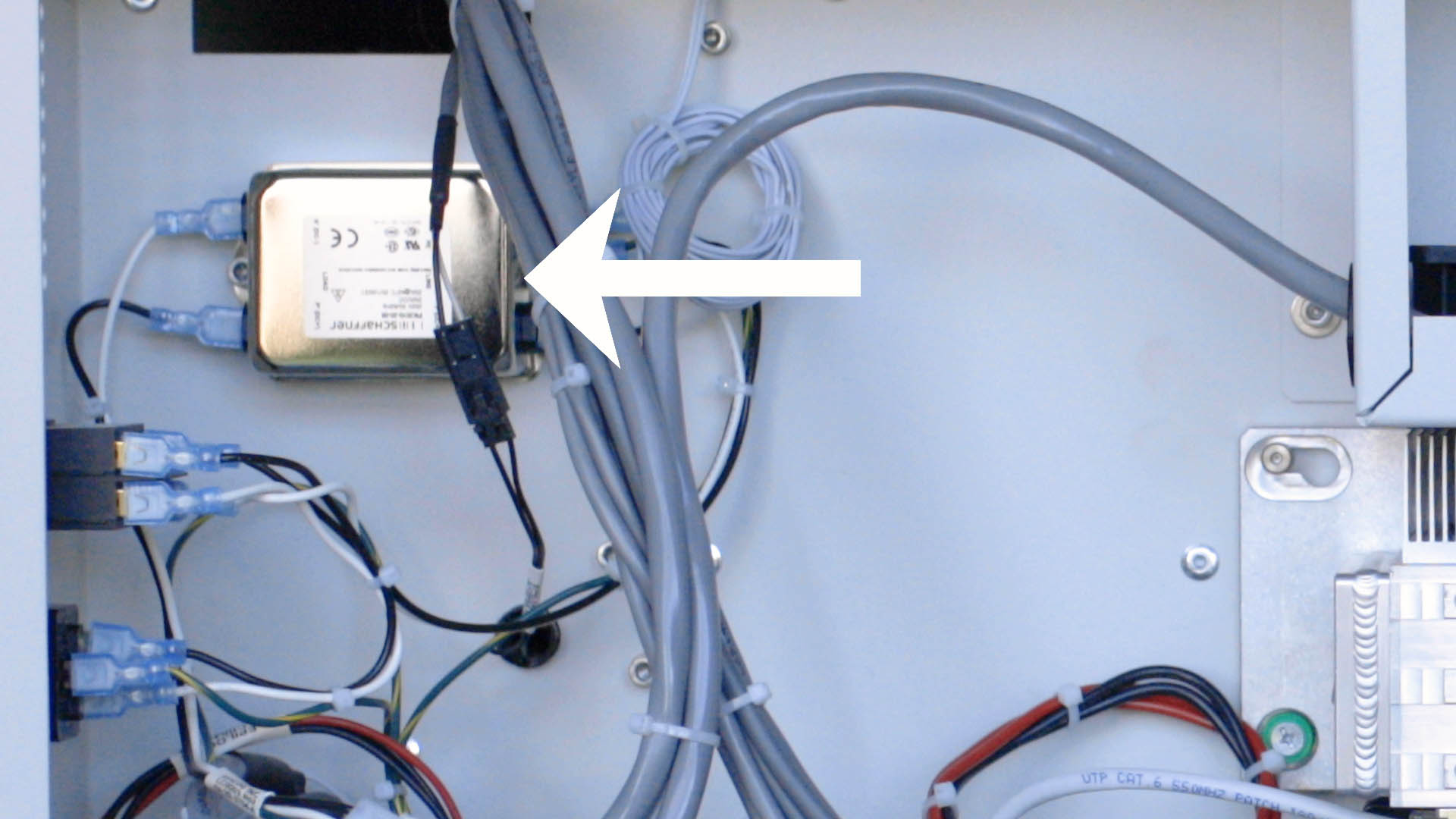 Now, disconnect the Power line filter connection. The filter is the silver box in the upper left-hand corner of the machine.