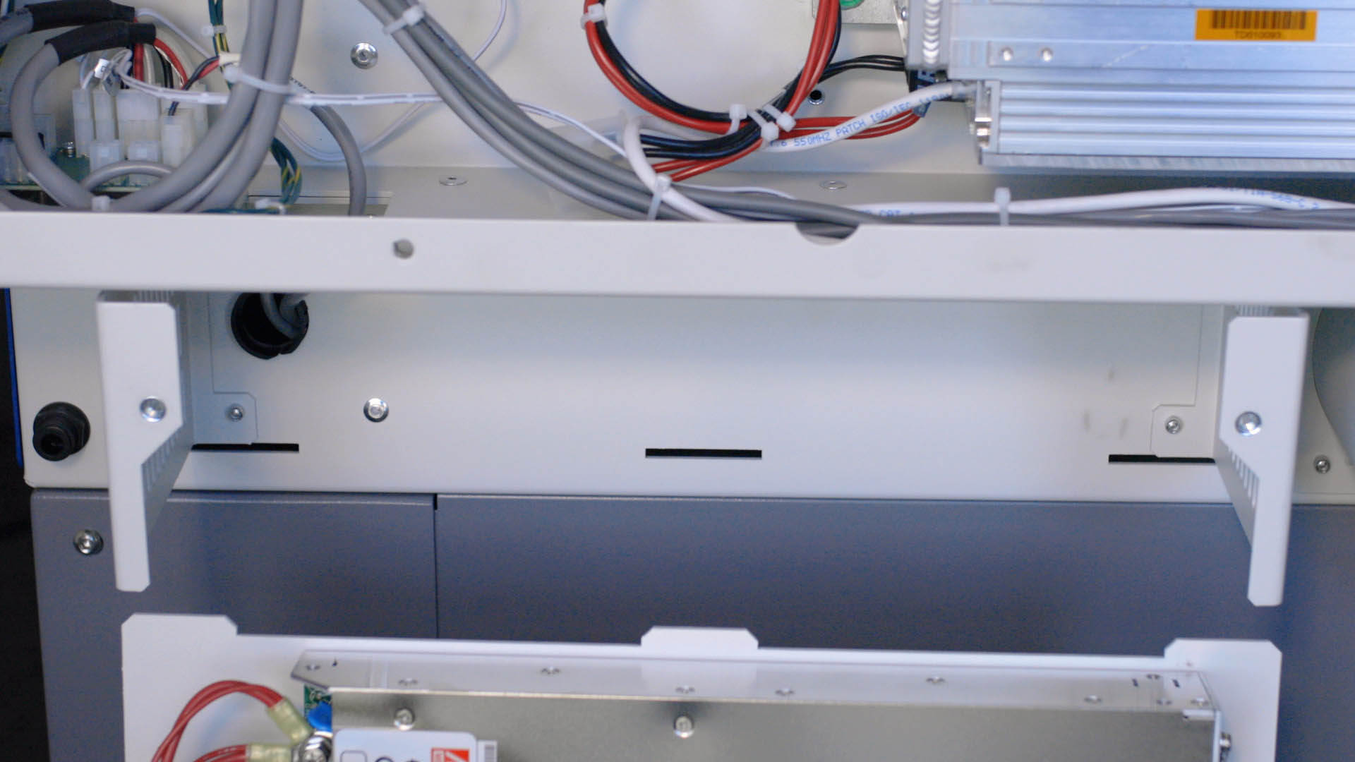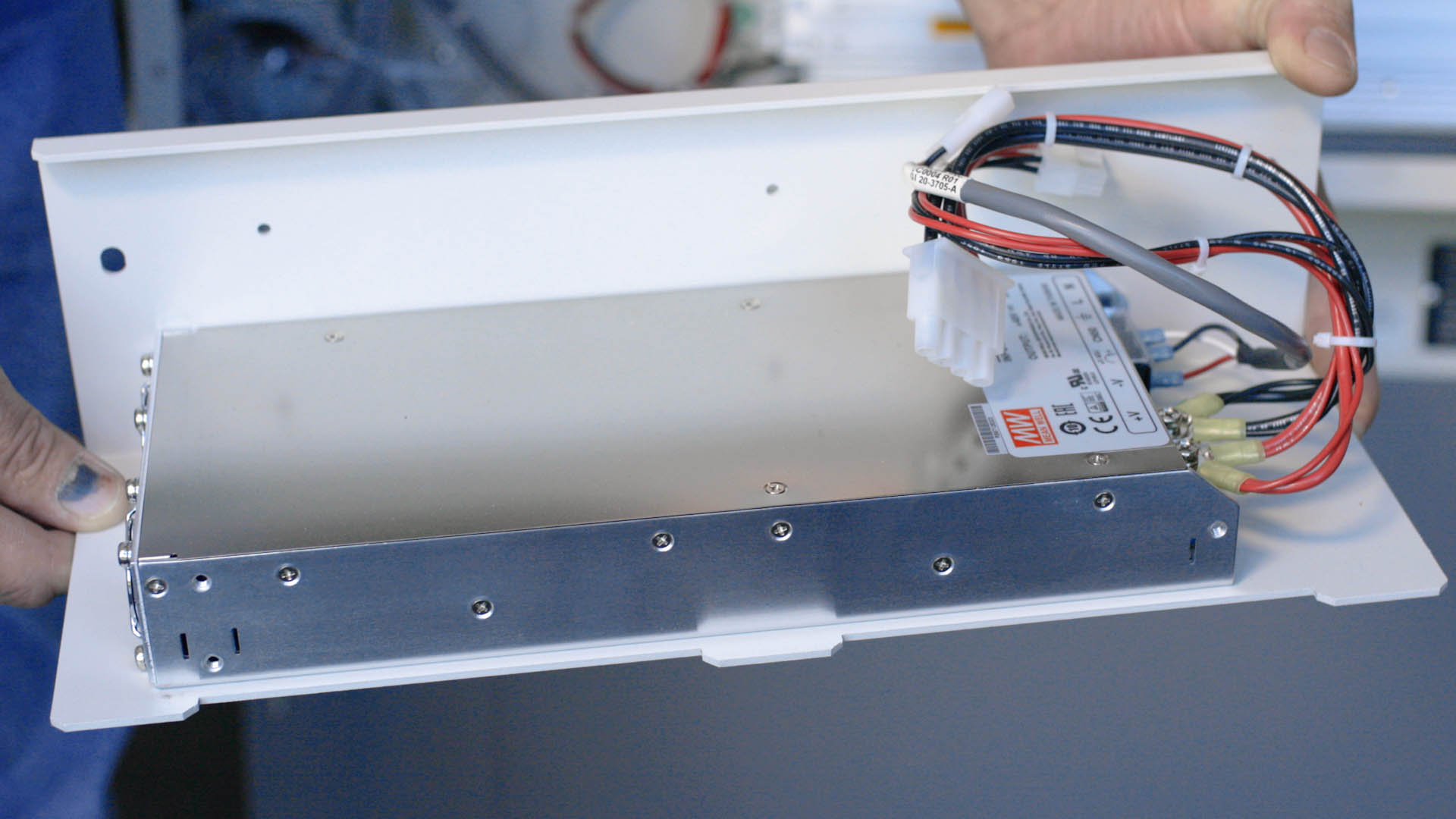 While supporting the power supply from below, remove the two 5/32″ Allen screws securing the power supply assembly to the machine.