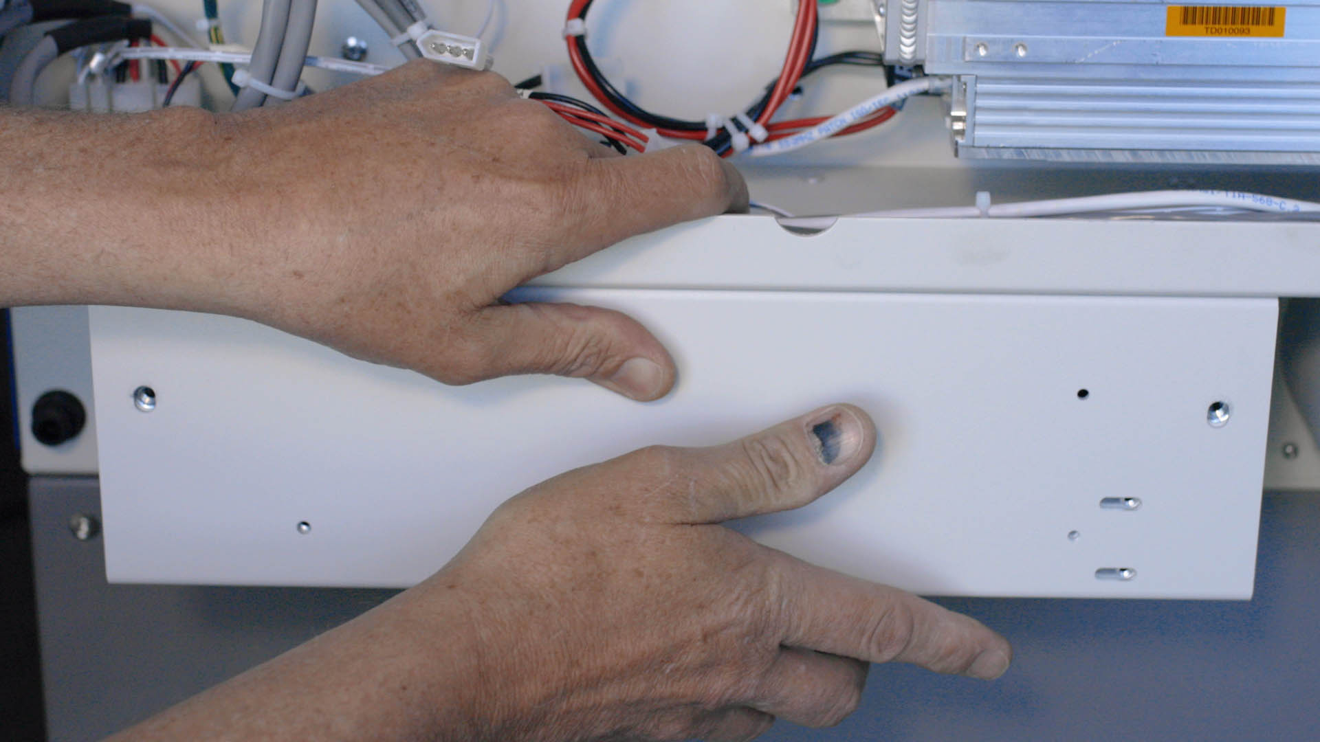 Replace the rear panel on the machine using the 5/32″ Allen wrench to tighten all of the screws that secure it to the machine.