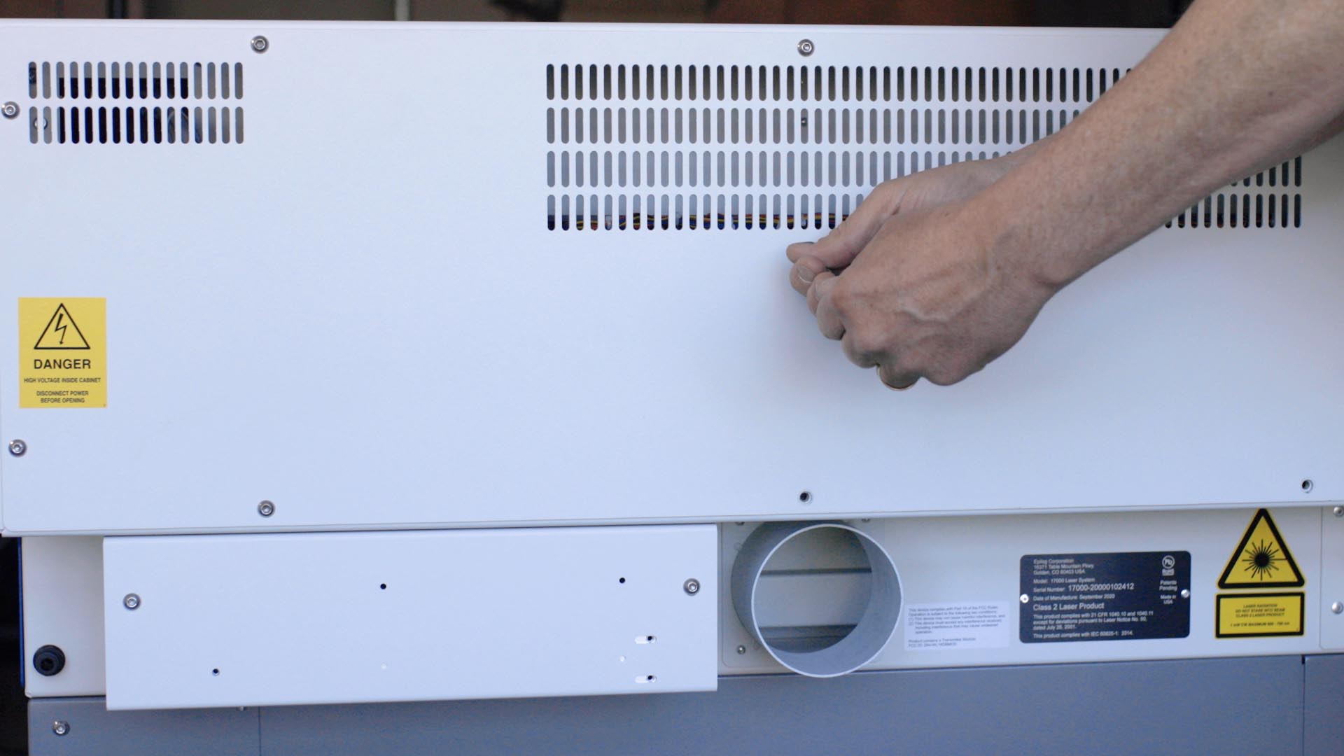 Using the 5/32″ Allen Wrench, remove the 9 screws that secure the rear panel to the machine.