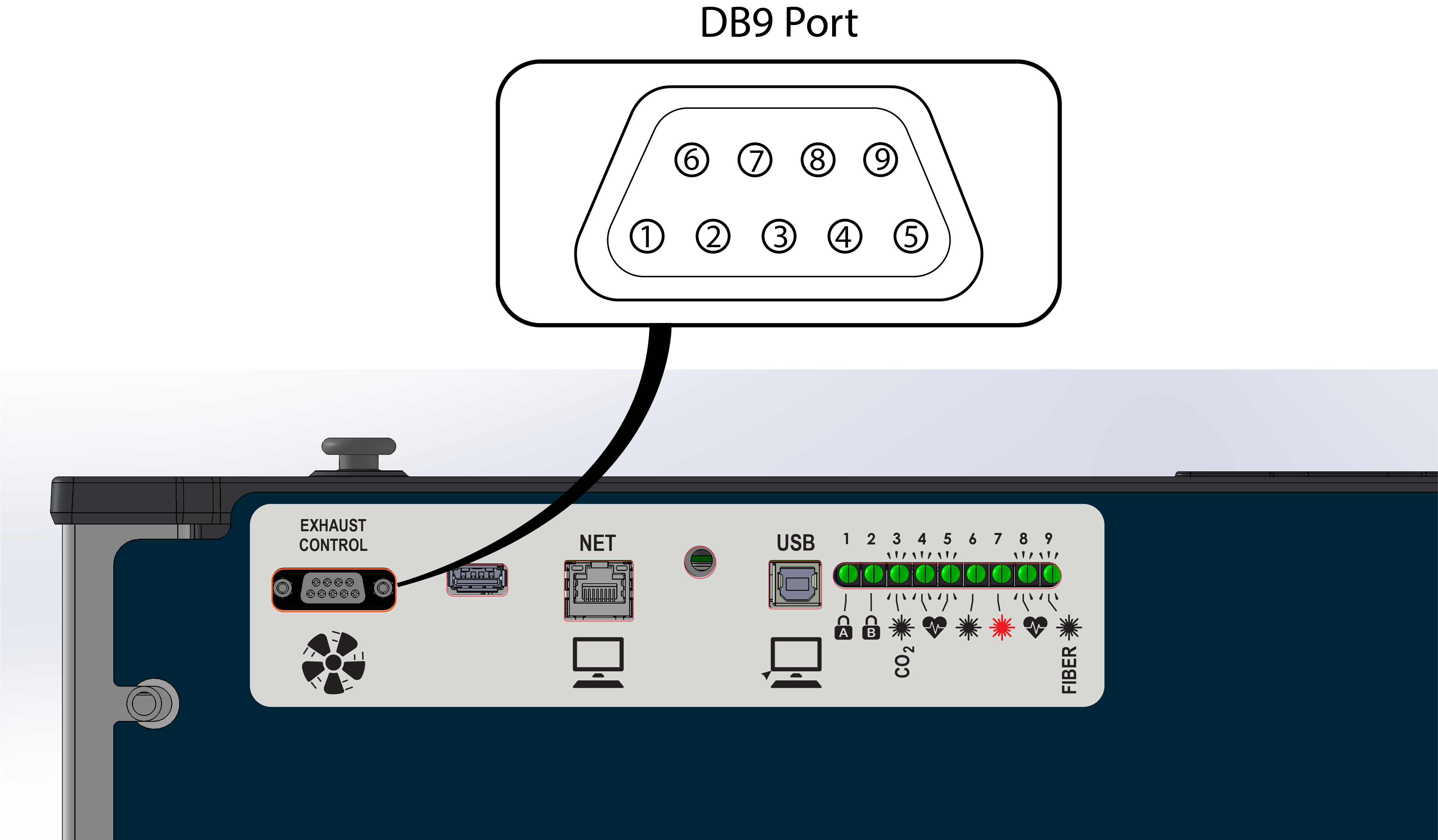 Epilog Fusion Maker, Edge, Pro, and Galvo laser systems include a DB9 port on the right side of the control panel for managing external filtration systems. These signals are automatically assigned based on the selected filter type in the Epilog control panel.