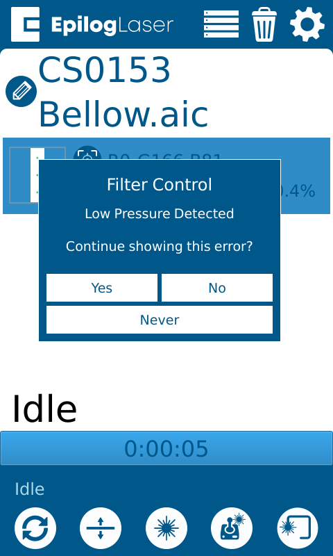 When a filter issue is detected, the filtration unit will connect pins 8 & 9, triggering a “Low Pressure Detected” message on the Epilog UI.