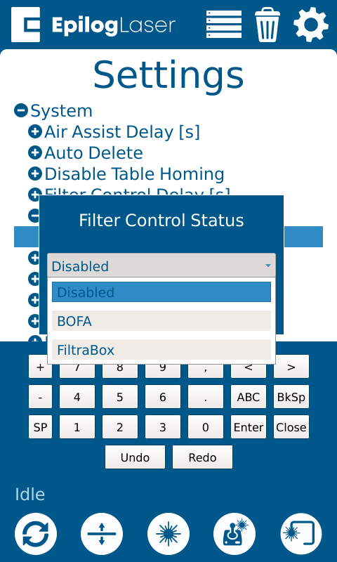 Currently, Epilog officially supports two filtration systems: Filtrabox and BOFA. Other filter systems may be compatible as long as you know the pin requirements and wiring logic of the unit you’re integrating.