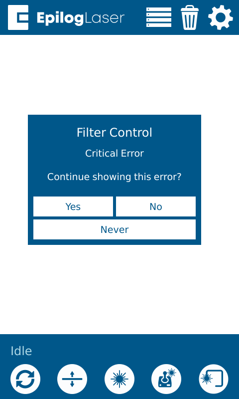 When a filter failure is detected, the filtration unit will connect pins 1 & 2, triggering a “Critical Error” message on the Epilog UI.