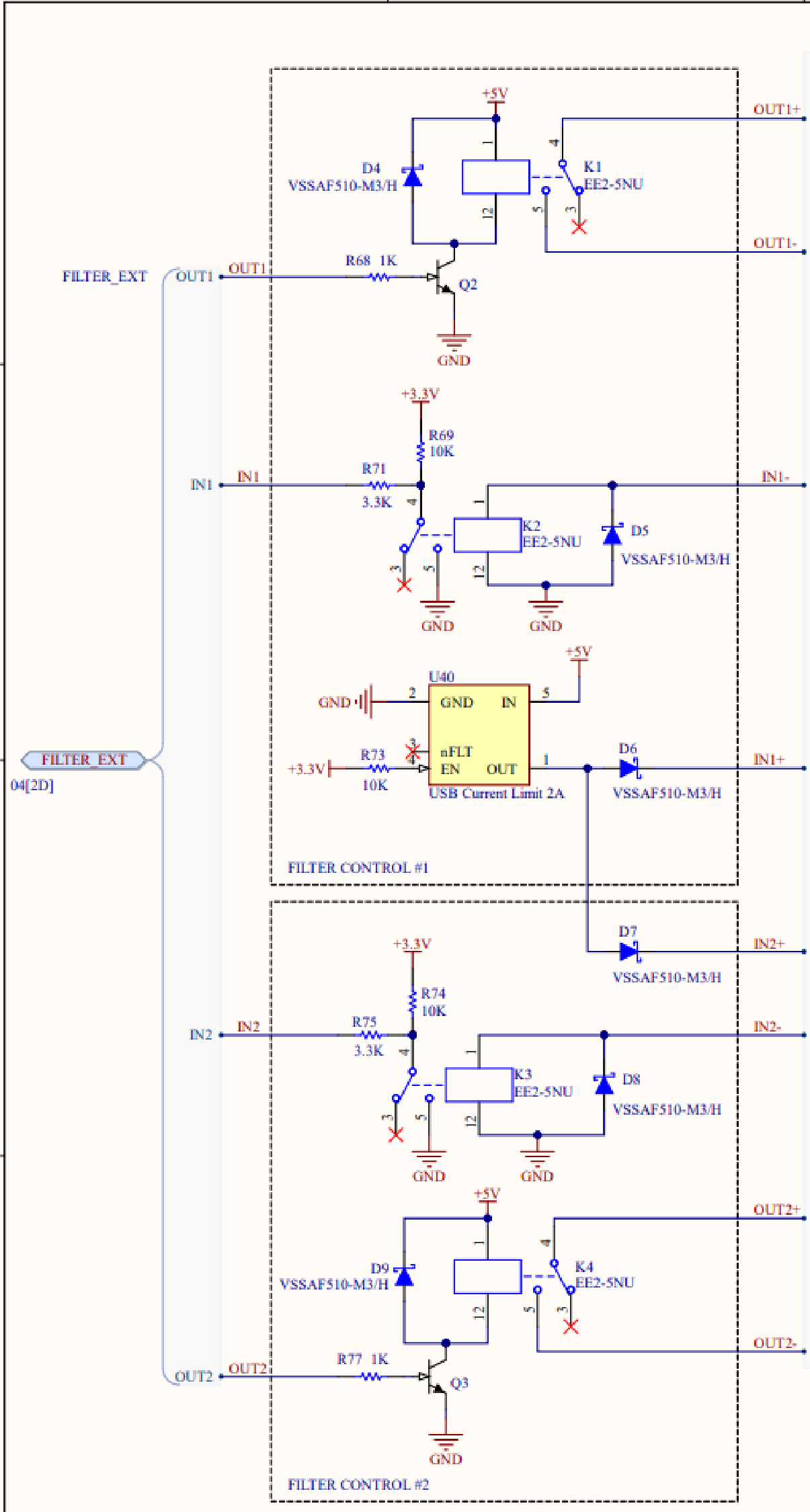 The output pins are controlled by internal relay contacts (EE2-5NU). These contacts are rated for low-voltage control signals. To prevent damage and ensure reliable operation, do not exceed 24V AC/DC and 100 mA across any output pin pair.