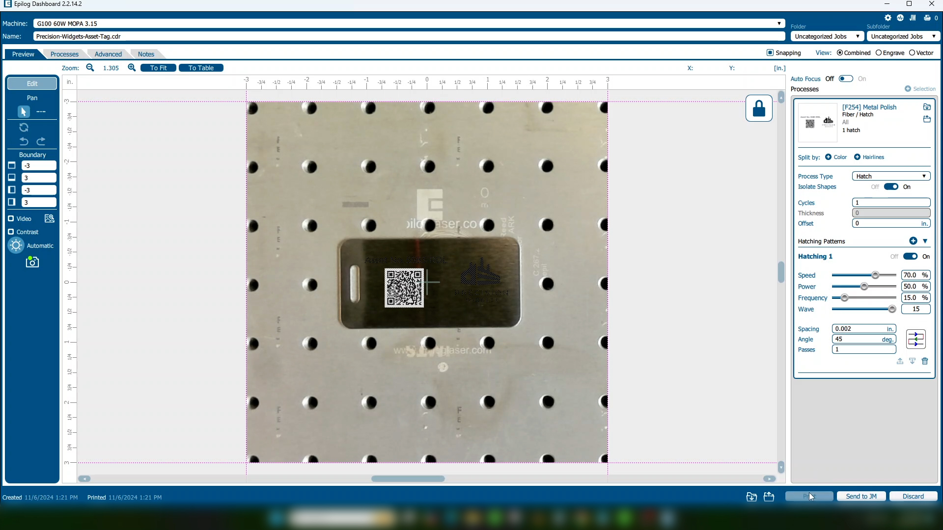 The job will appear in the Laser Dashboard, Epilog’s interface between the design and the laser where you’ll set up all of your settings. Here we can position our graphic using the camera for positioning.