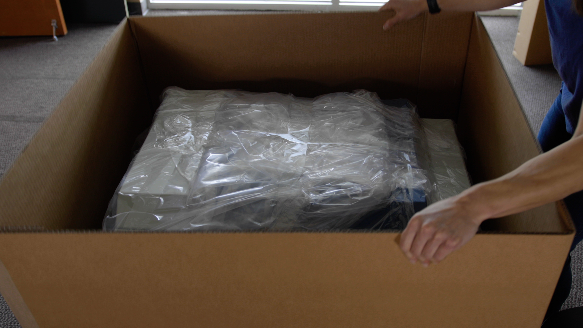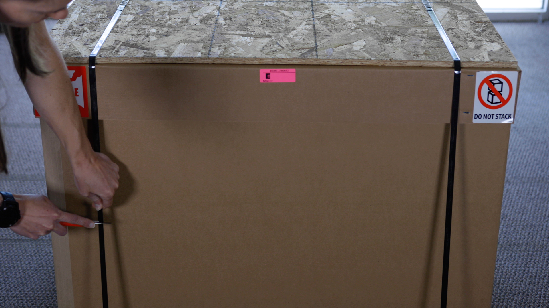 Start by using scissors or a utility knife to cut the box straps. Stand clear of the straps, as they are under high tension and may pop out at high speed when cut.
