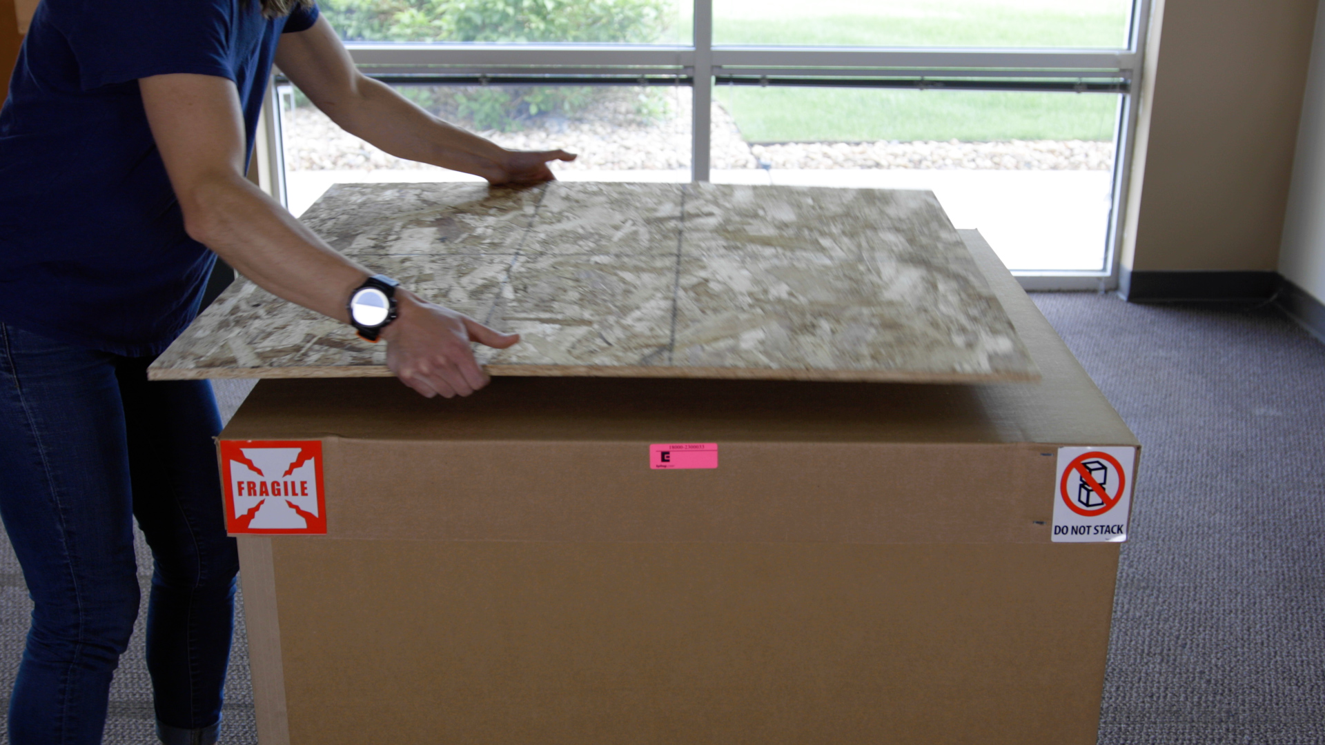 Remove the wooden board sitting on top of the box and set it to the side.