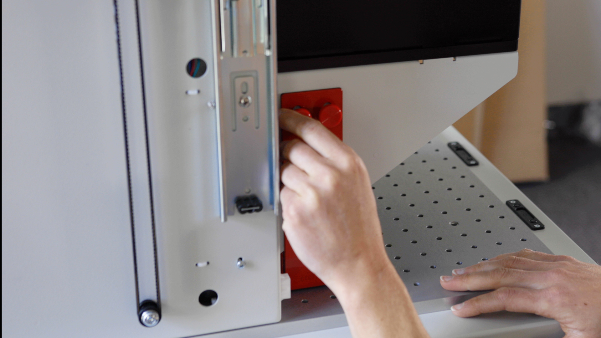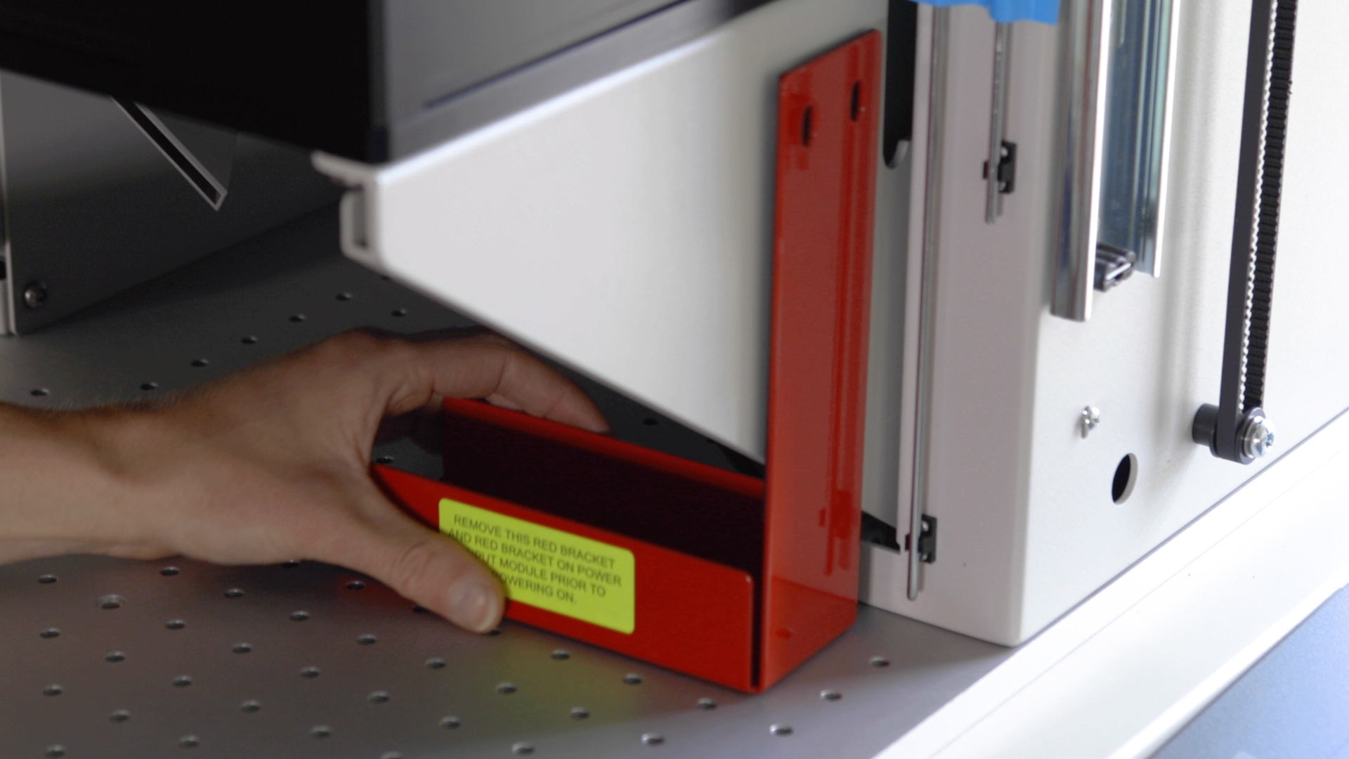 There are two red brackets holding the lens platform in its shipping mode. Remove the red thumbscrews from both brackets and then remove the brackets from the interior of the machine. The lens platform will remain in place after removing the red thumbscrews.