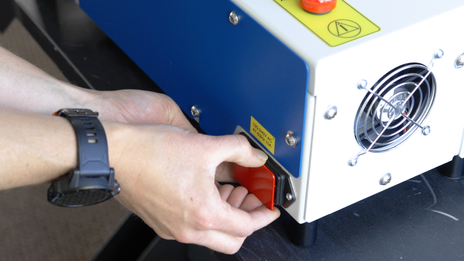 The Fusion Galvo G100 systems weigh approximately 131 lbs (59.5 kg). You will need the help of an additional person when lifting the Fusion Galvo off the pallet and placing it on a stand or table. You will need to place it upright on a suitable surface allowing enough room for easy access to the back of the unit for the exhaust setup.