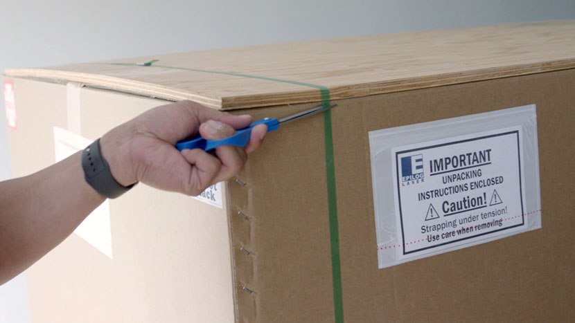 Remove the straps and the wooden box topper. Then lift and remove the cardboard box.