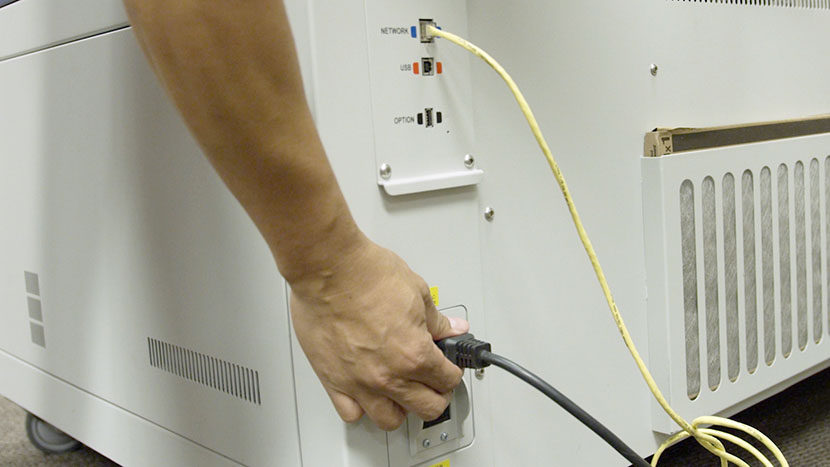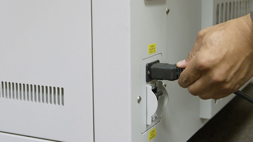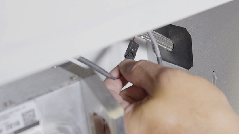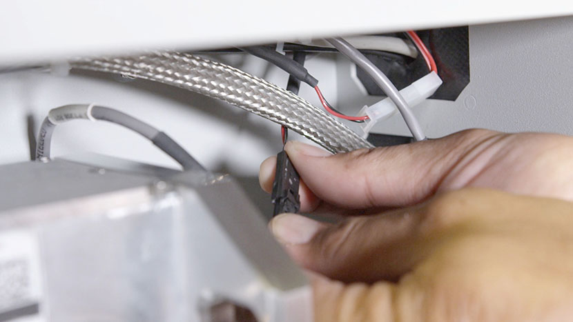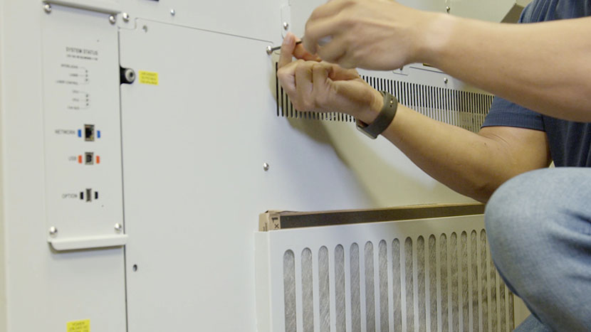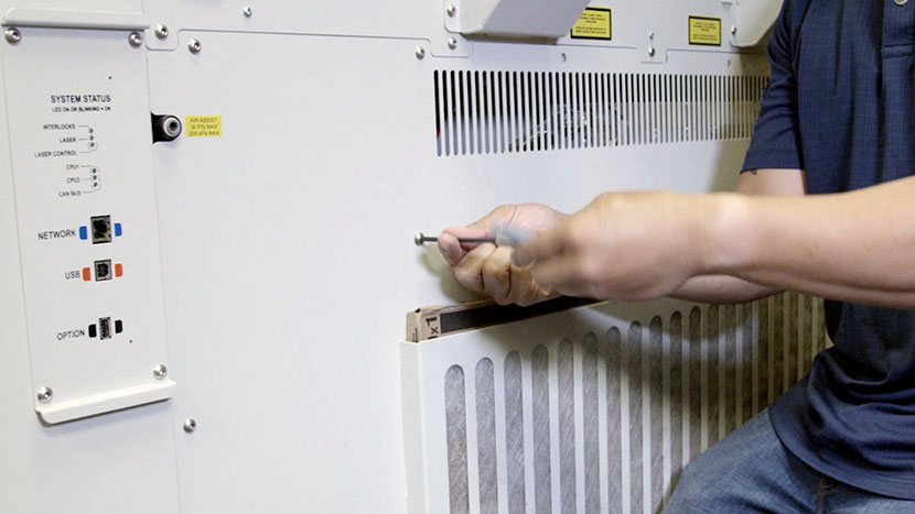 Use a 5/32” hex key to insert the hex screws which secure the lower panel on the rear of the machine.