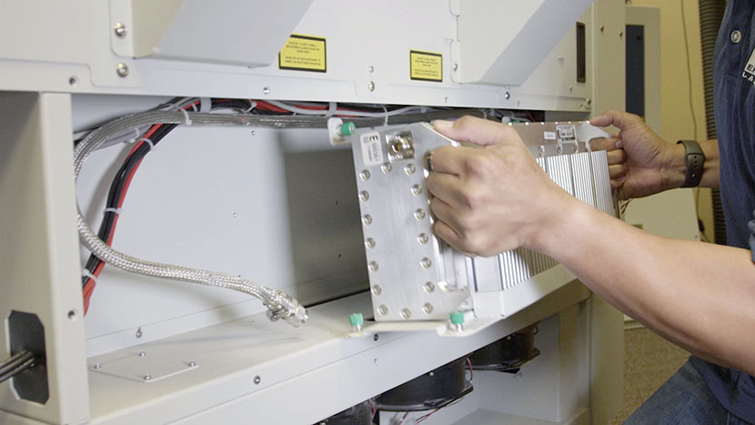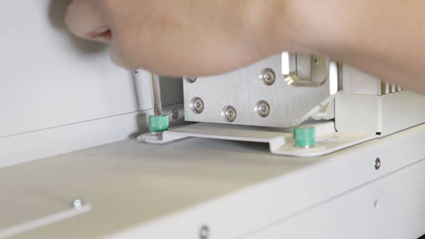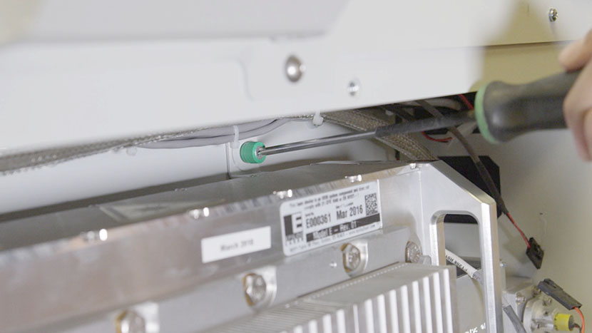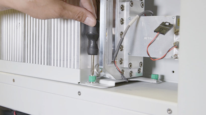 Affix the new laser tube to the machine by tightening the six green captive screws.