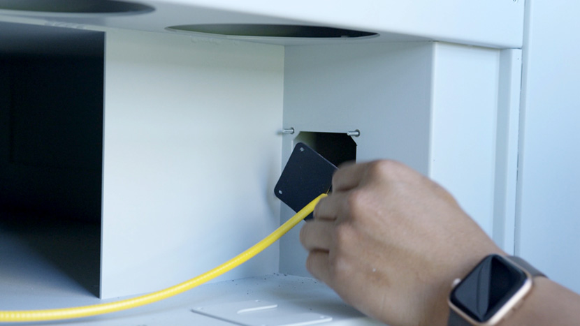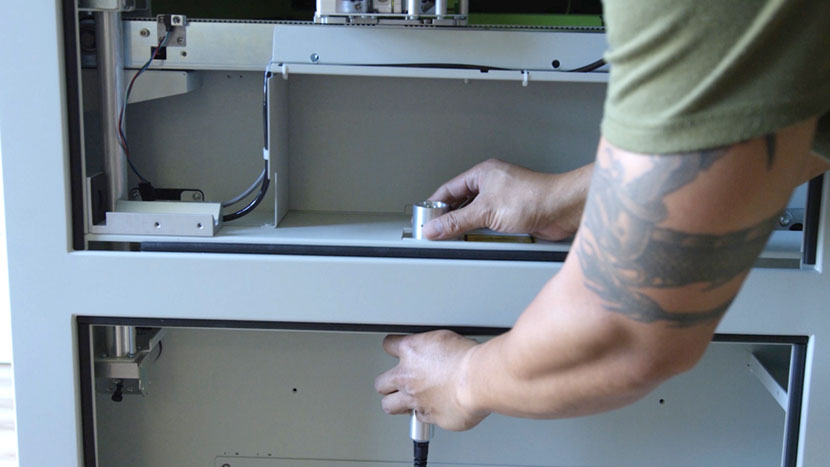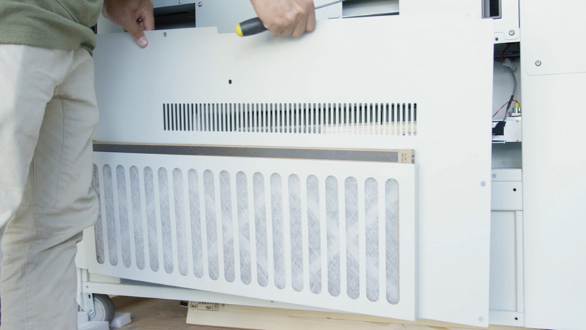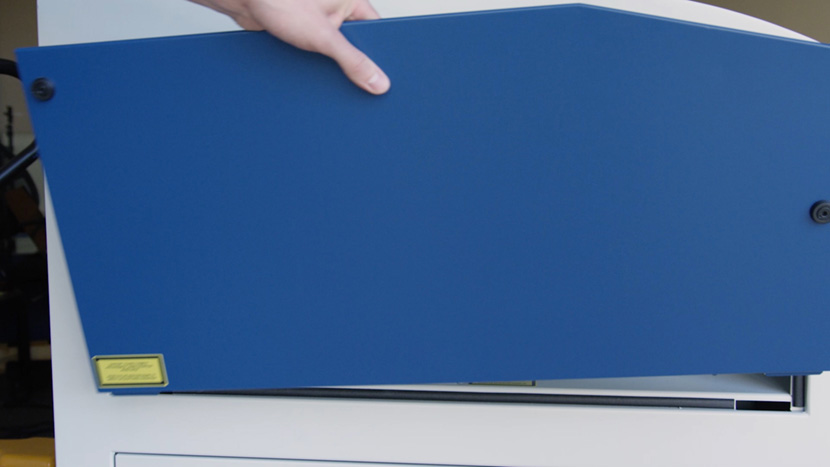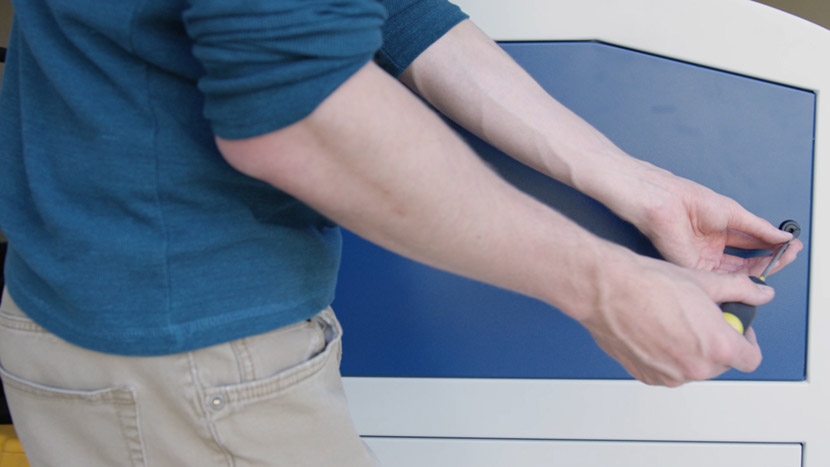 Replace the top access panel on the left side of the machine, using a 5/32” hex key to turn the black panel locks ¾ of the way clockwise.