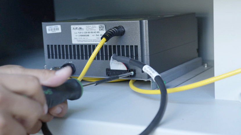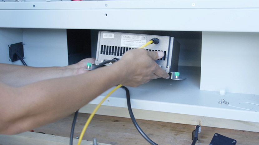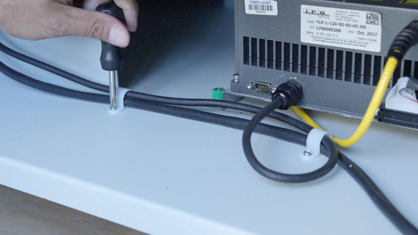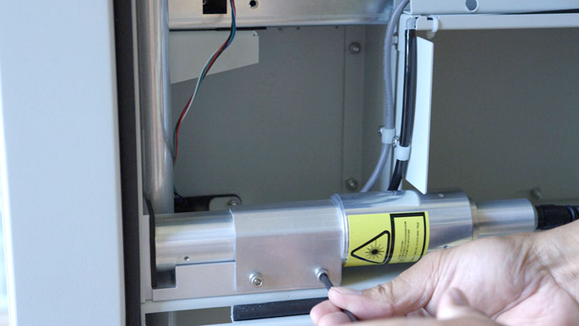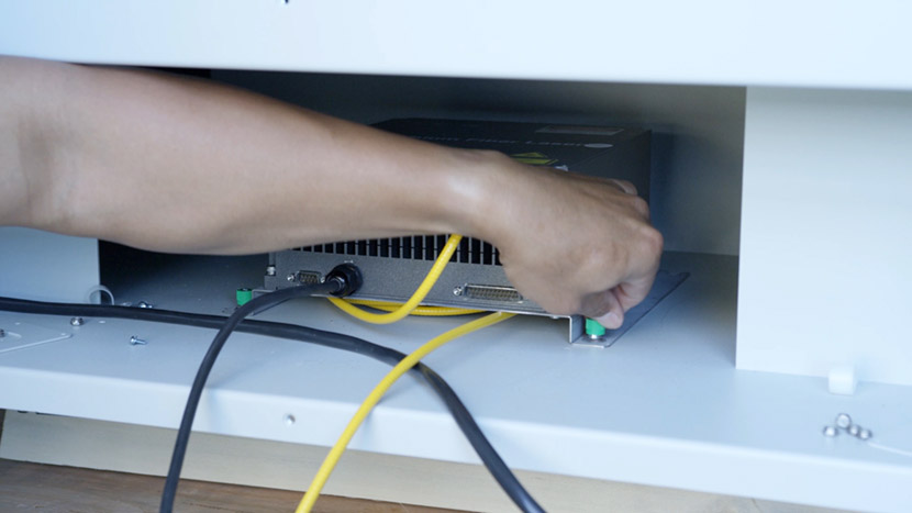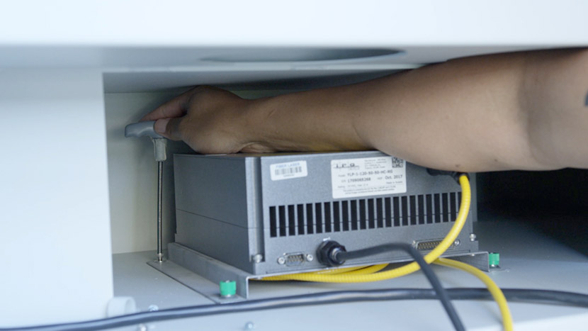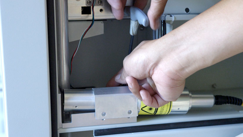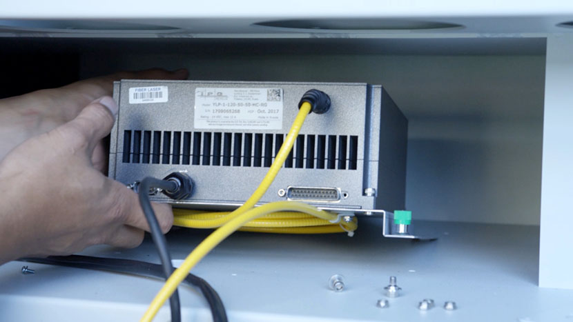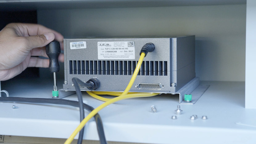 To install the new fiber laser tube, place the laser tube in the bottom compartment and align the front captive screws with the screw holes in the chassis.