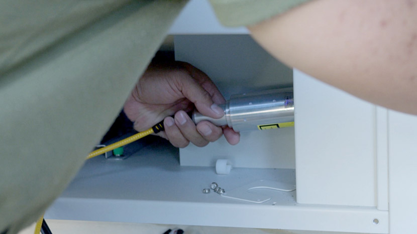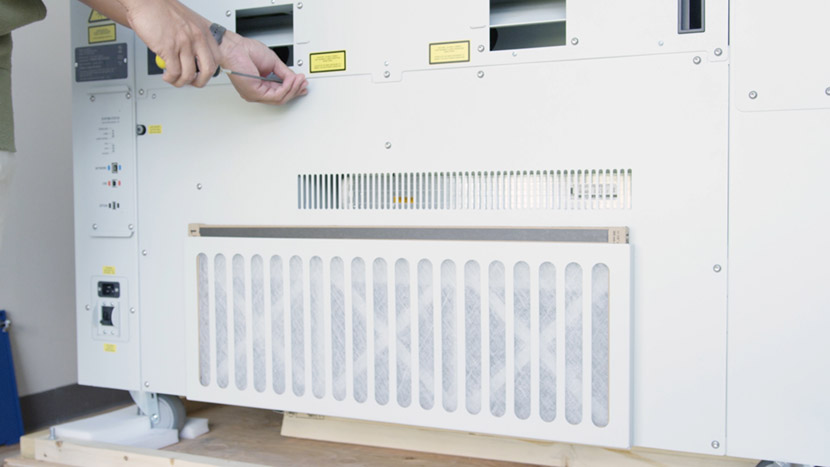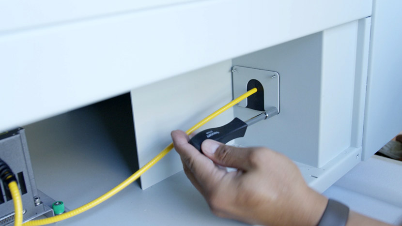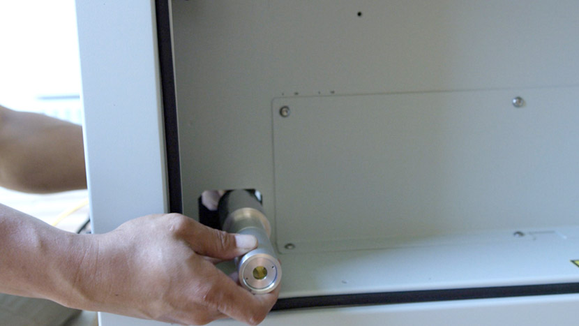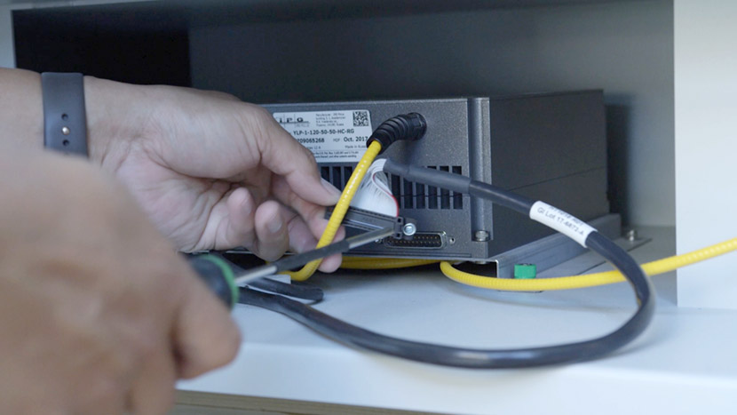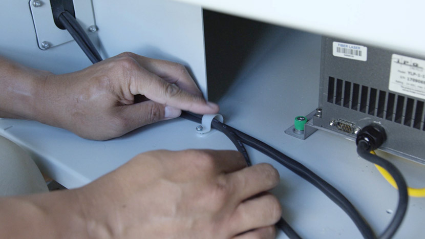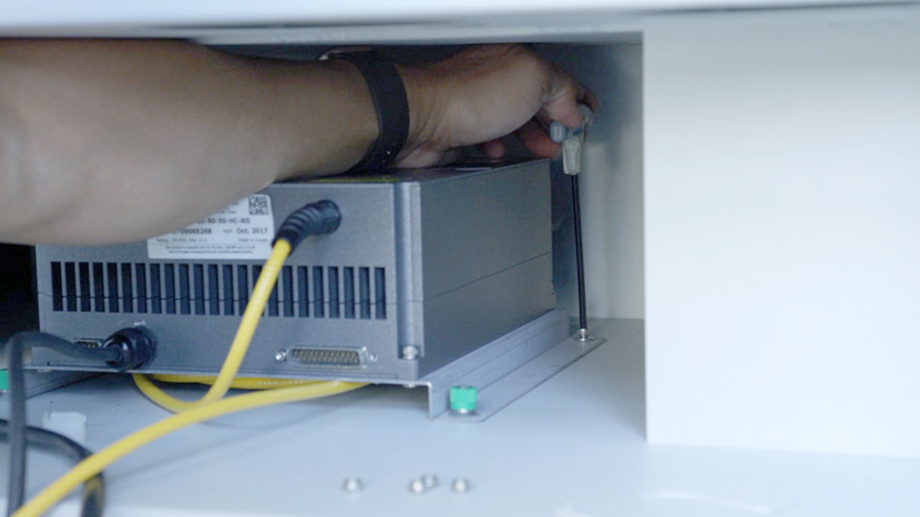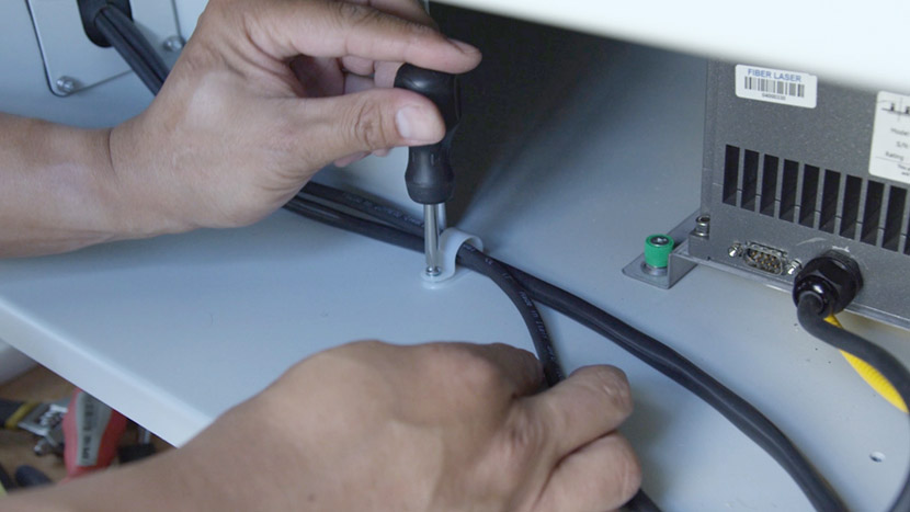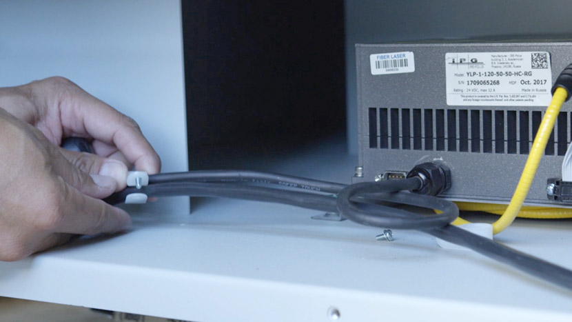 To install the new fiber laser tube, place the laser tube in the bottom compartment and align the front captive screws with the screw holes in the chassis.