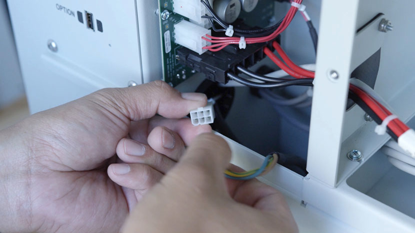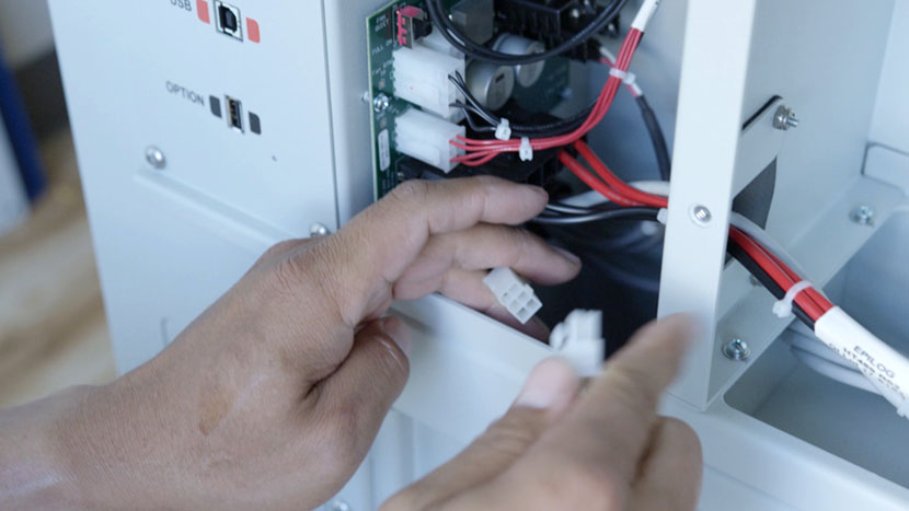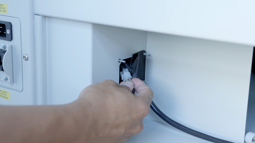 In the control board compartment, disconnect the white connector at the end of one of the laser tube’s wires.