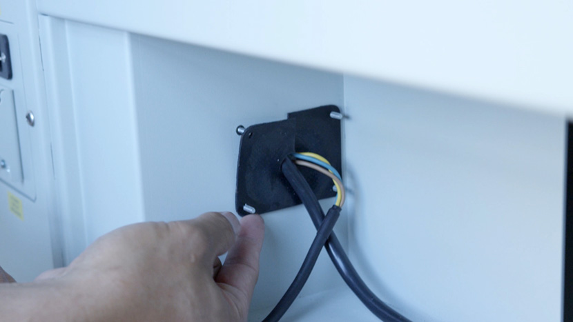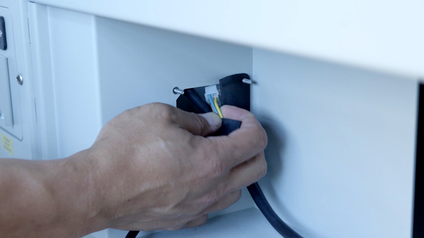 Feed the laser tube’s white connector through the rubber flap on the left side of the compartment, then up into the control board compartment and connect it.