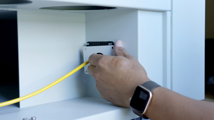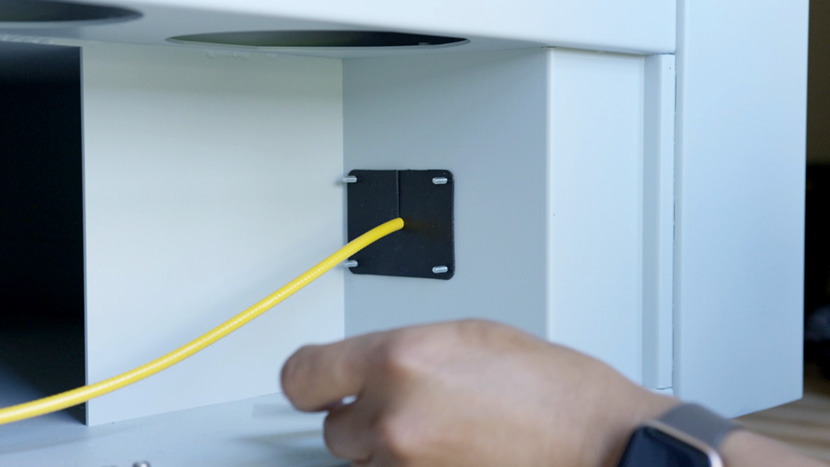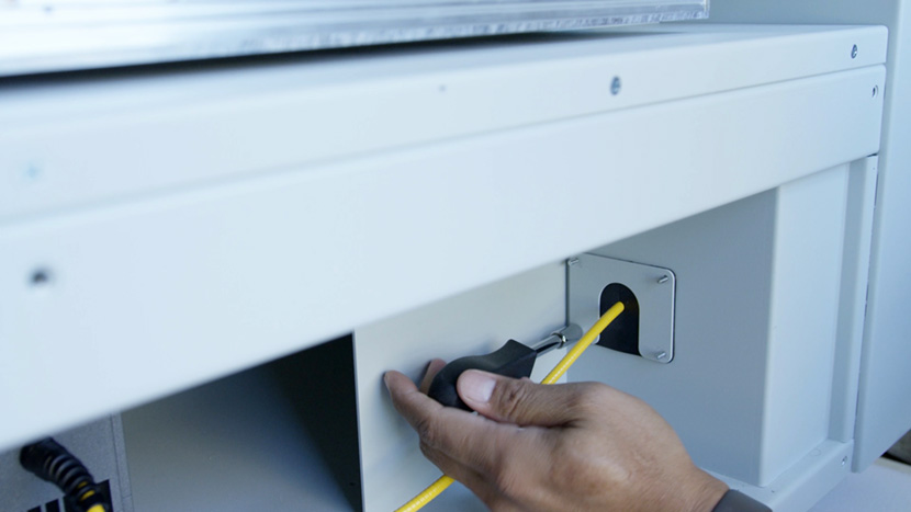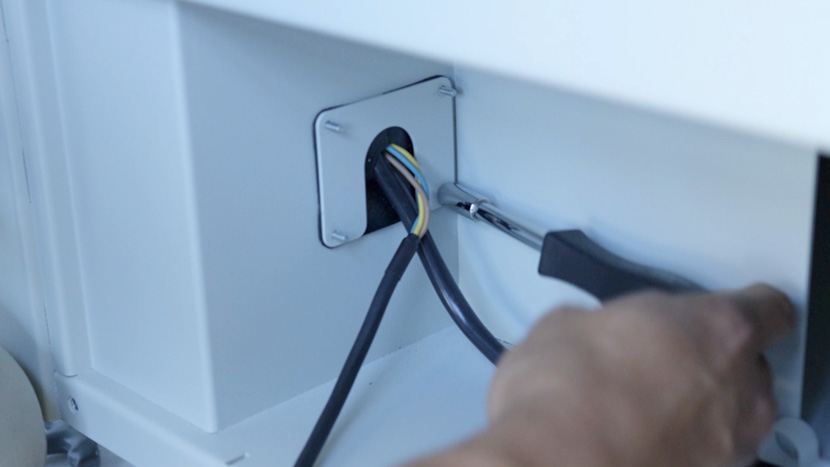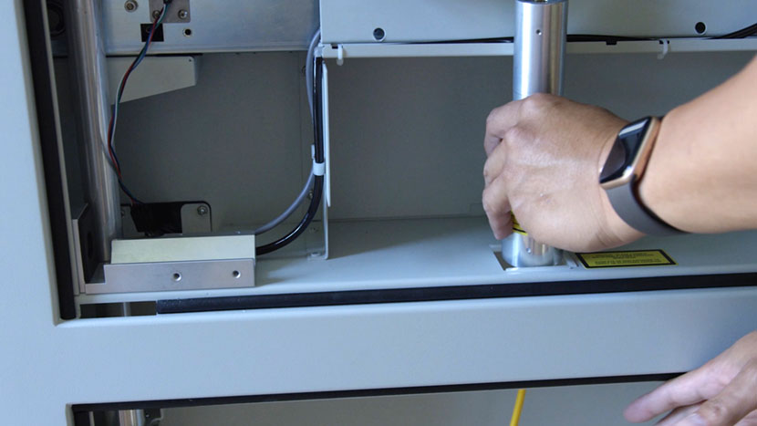 Use a 5/32” hex key to insert the hex screws that secure the lower panel to the rear of the machine.