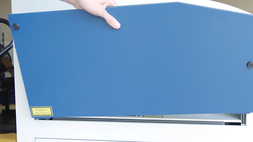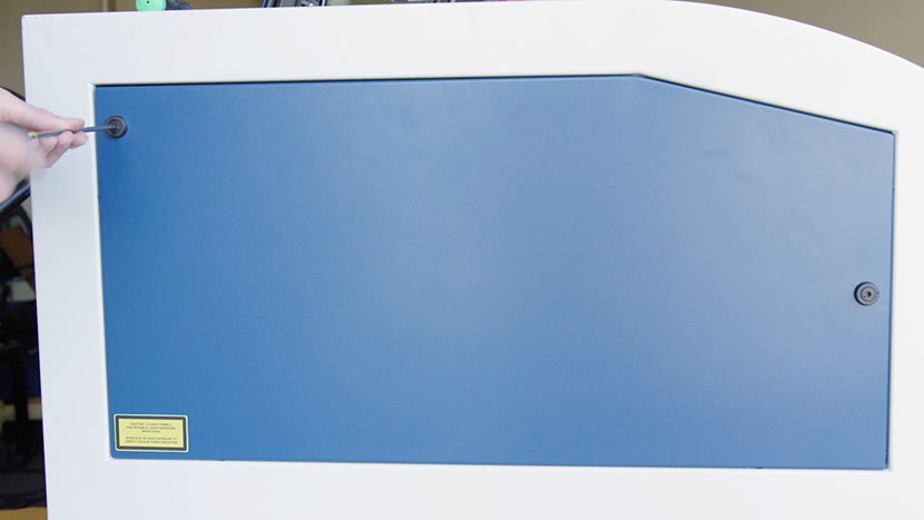 Remove the top access panels on both the left and right side of the machine by using a 5/32” hex key to turn the black panel locks ¾ of the way counter-clockwise.