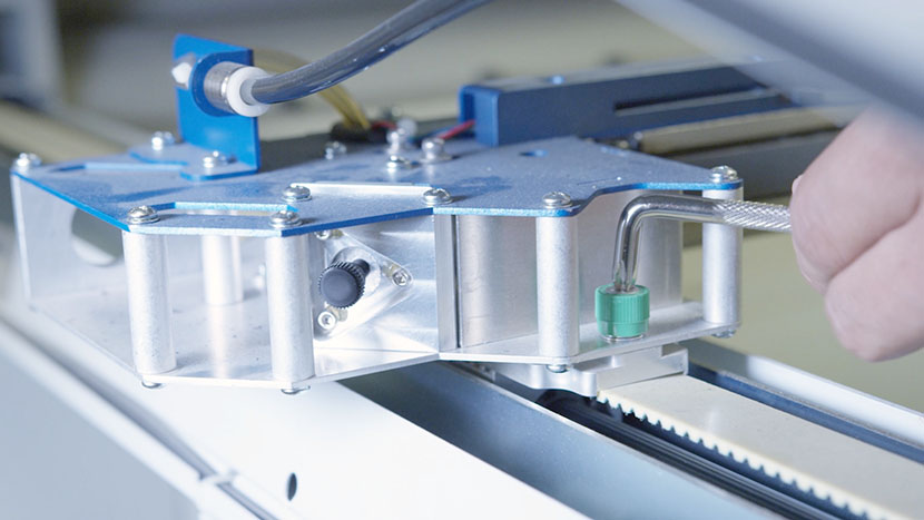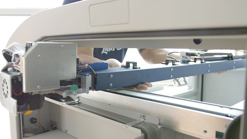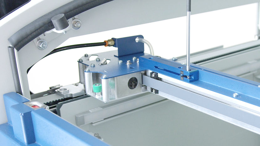 Place the x-axis assembly back on its mountings and secure it by tightening its four green captive screws.