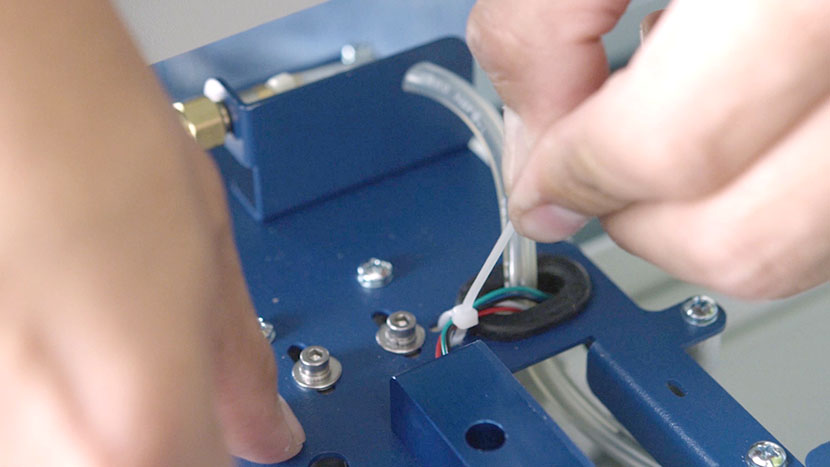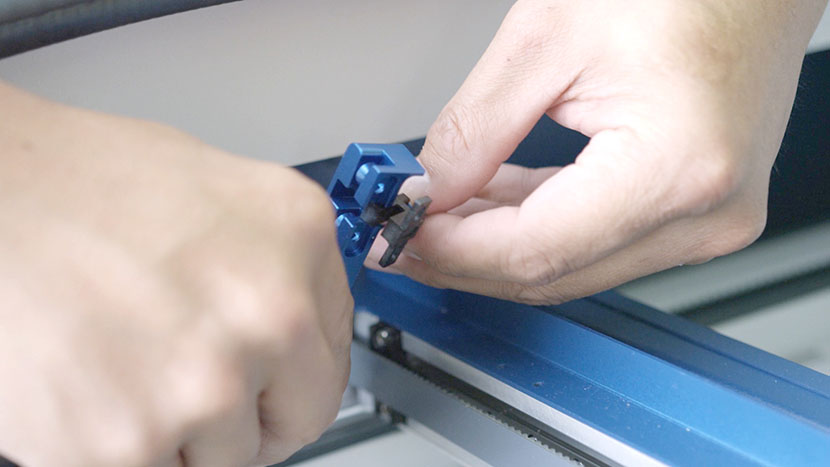 Slide a new zip tie through the two small slots on the x-axis assembly and secure it around the sensor’s wires.
