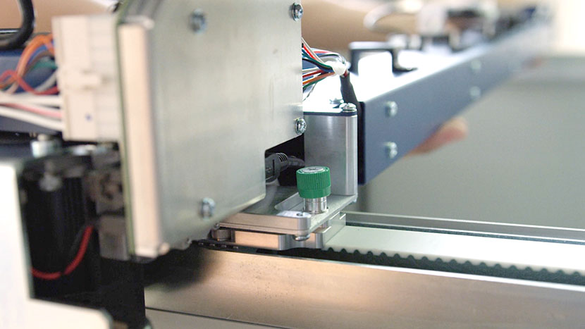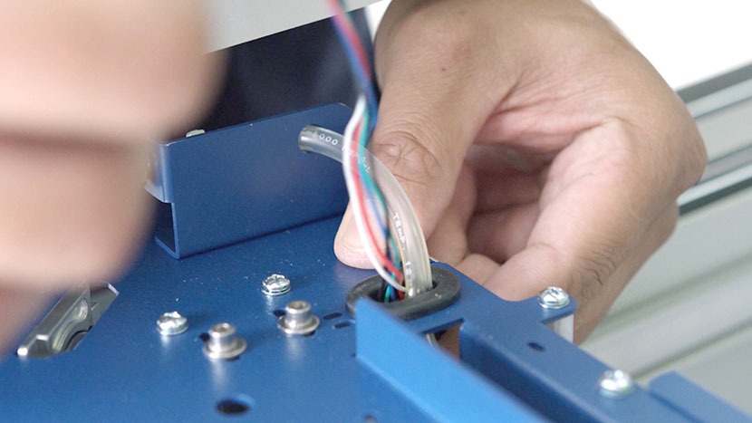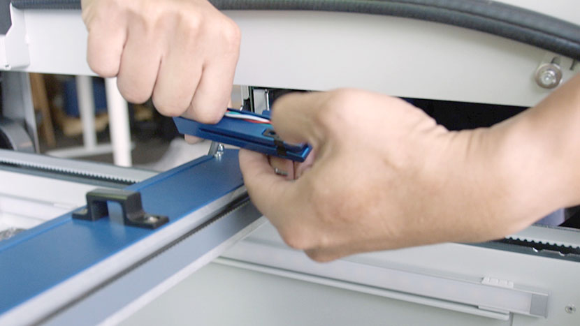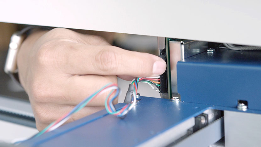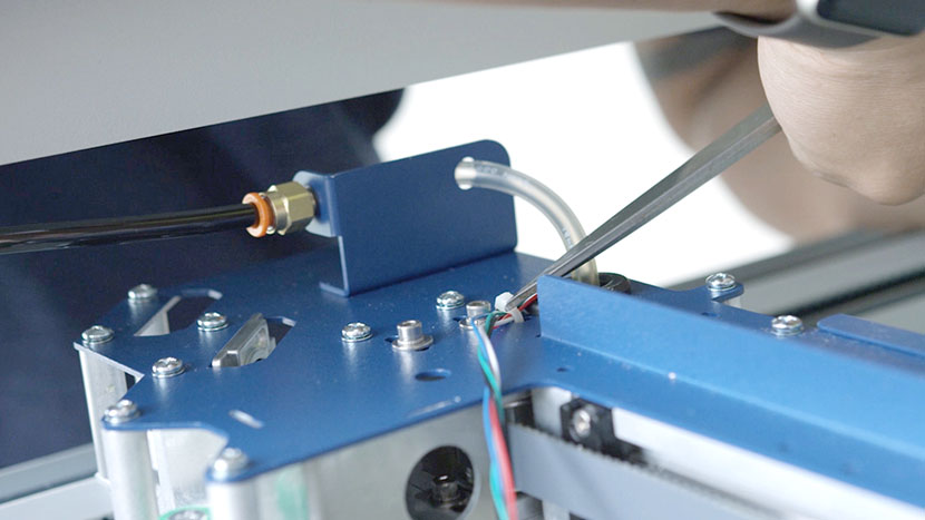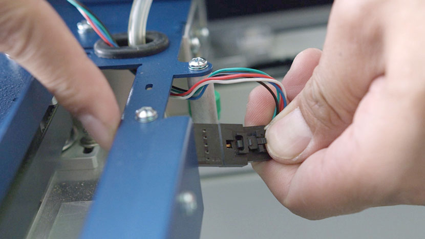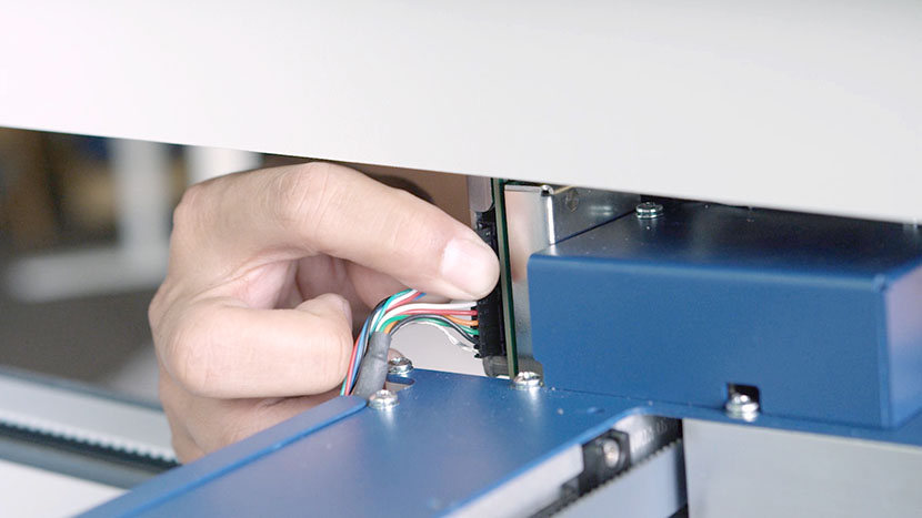 In the back of the x-axis assembly, disconnect the sensor’s black connector and slide it out through the hole where the Air Assist tube is also located.