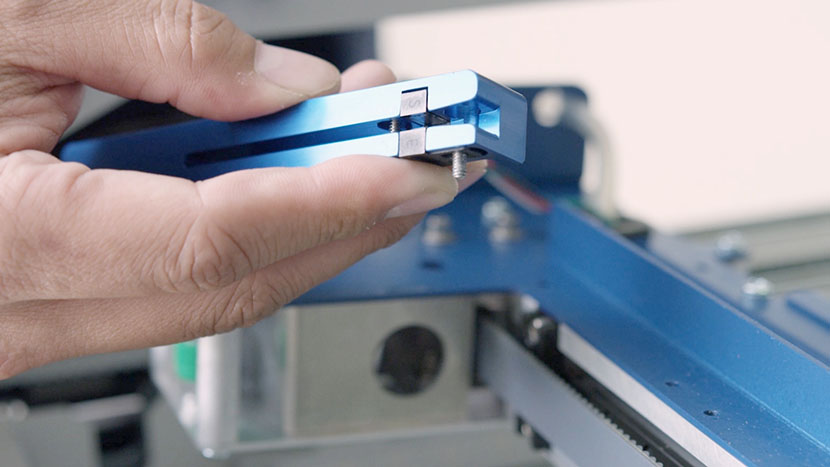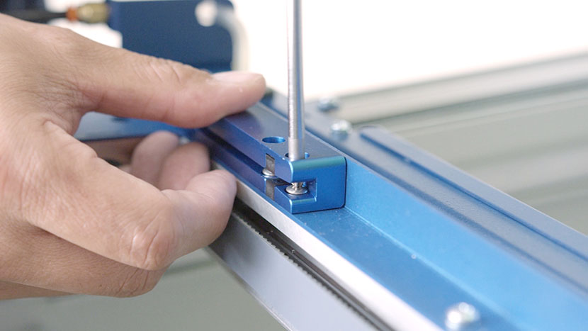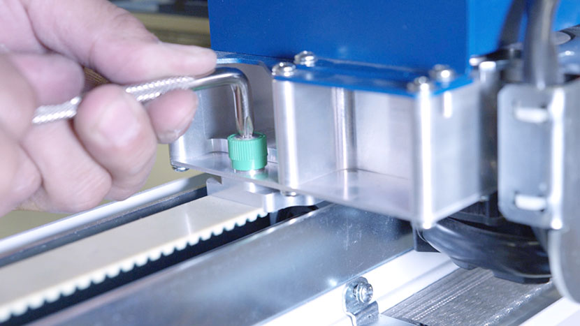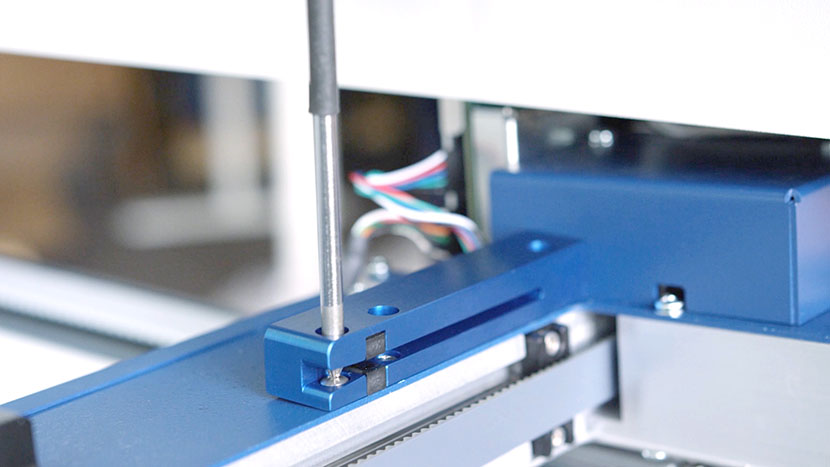 On both ends of the x-axis assembly, loosen the two green captive screws until they turn freely.