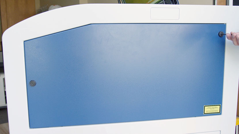 Replace the top access panels on the left and right sides of the machine, using a 5/32” hex key to turn the black panel locks ¾ of the way clockwise.