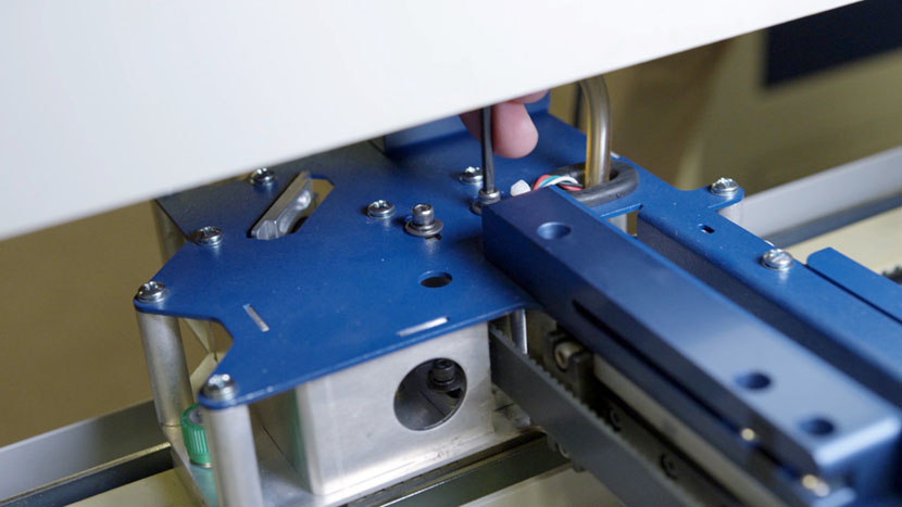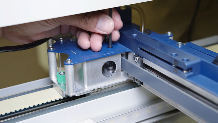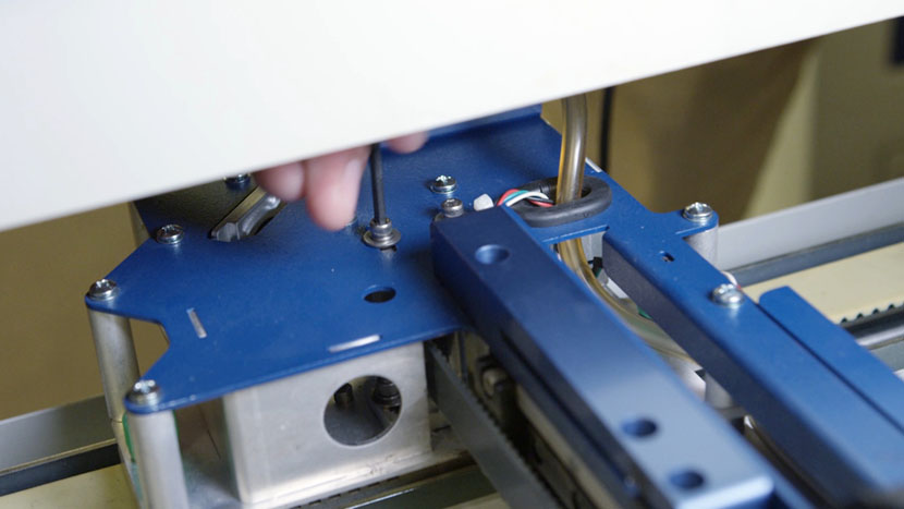 Use a 5/32” hex key to adjust the tensioning screw accessible from the end of the x-axis assembly.