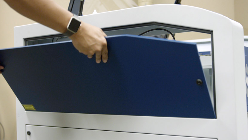 Remove the top access panel on the left side of the machine by using a 5/32” hex key to turn the black panel locks ¾ of the way counter-clockwise.