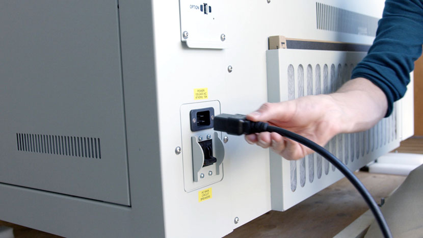 On the left side of the machine, find and disconnect the Air Assist tube from the x-axis assembly. Press the ring toward the rear of the engraver while pulling on the black tube.