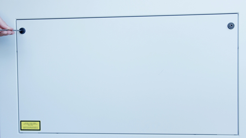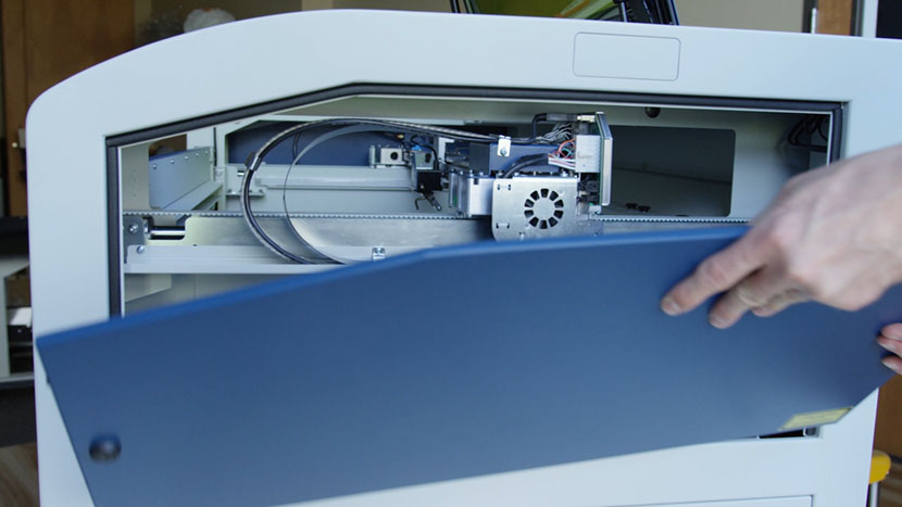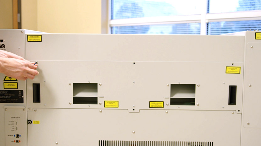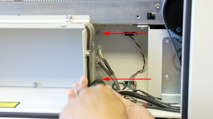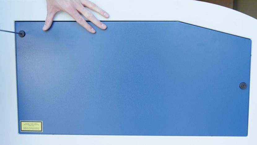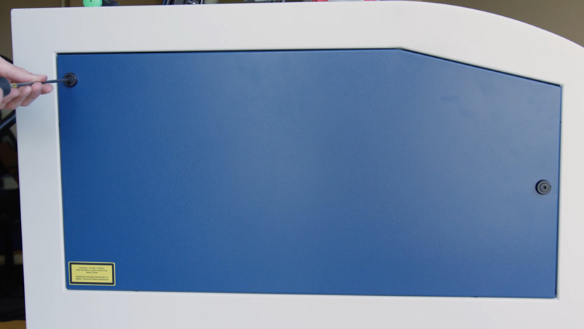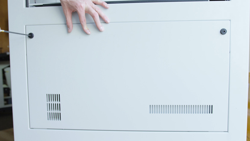 Next use a 5/32” hex key to remove the top access panel on the left side of the machine, as well as both the top and bottom access panels on the right side of the machine.