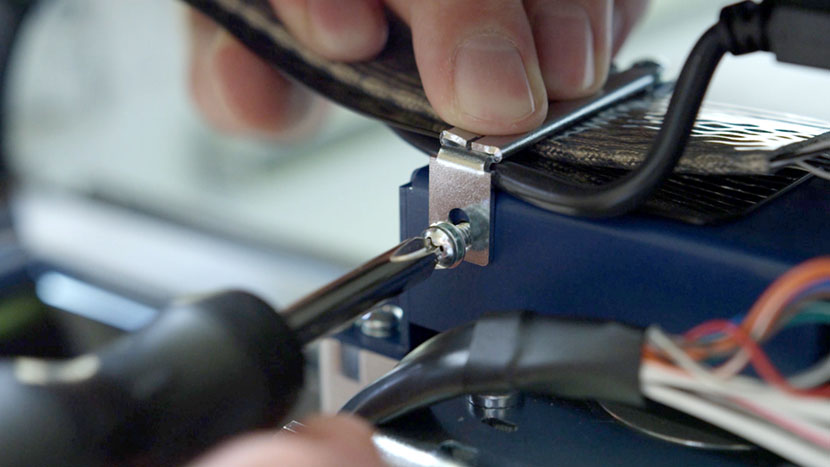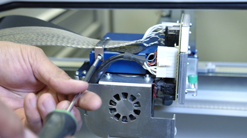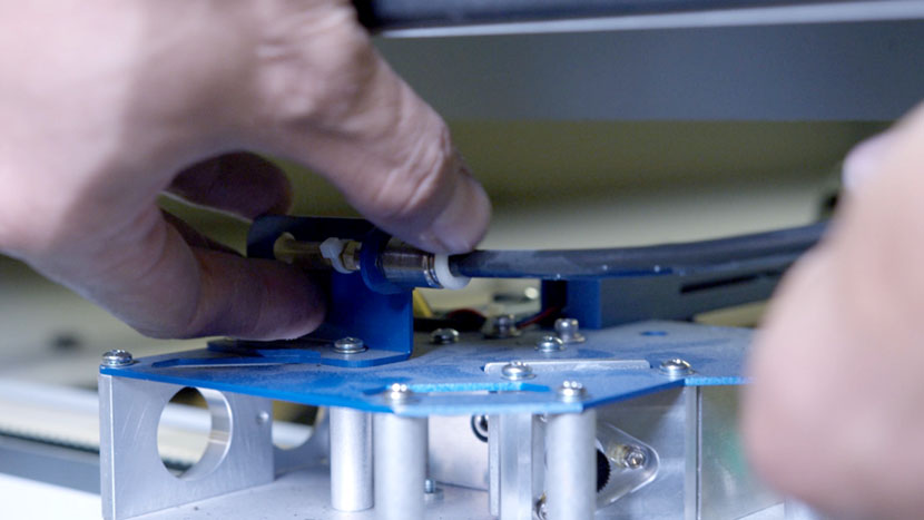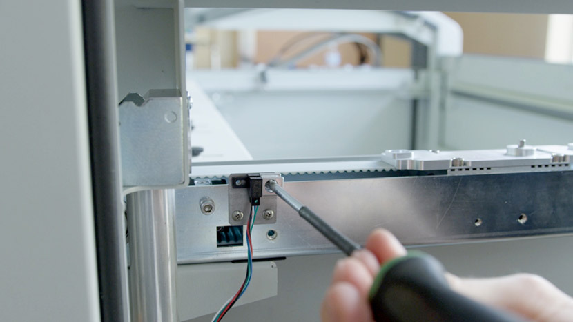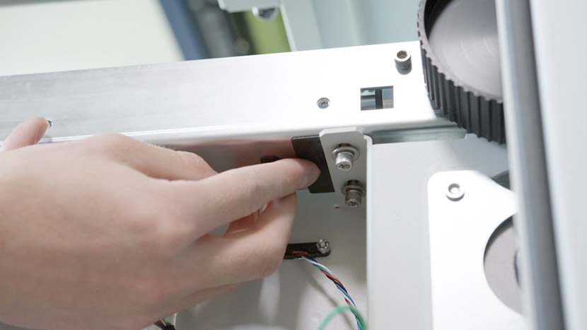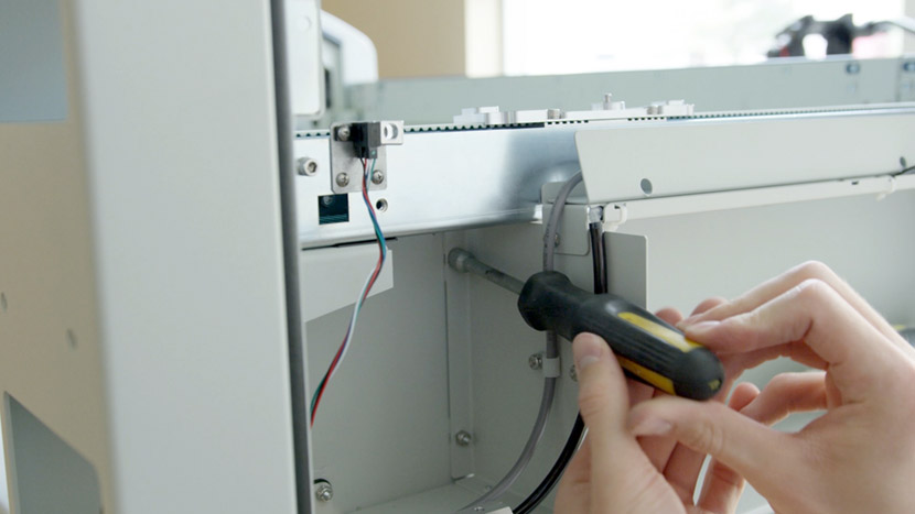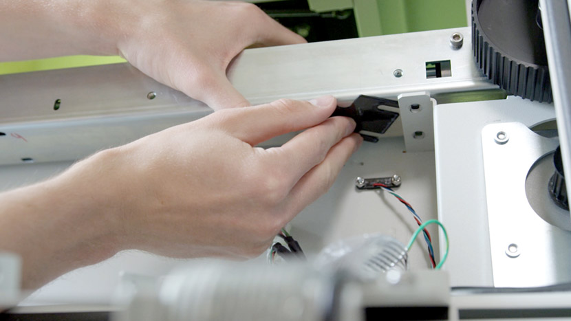 Use a Philips head screwdriver to insert the 2 screws that secure the rear axis sensor and switch guard to the side of the y-axis. Be sure to affix the switch guard on the sensor’s right side.