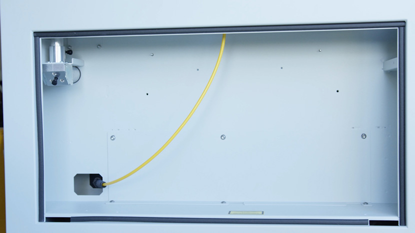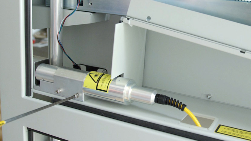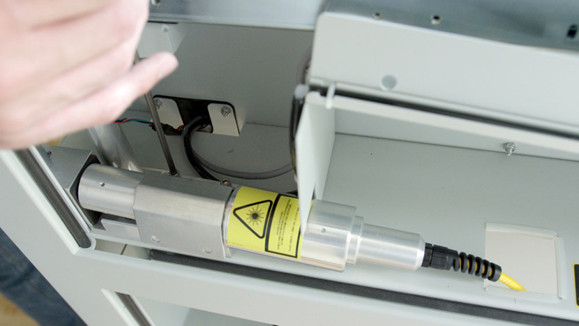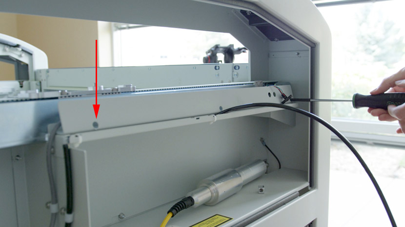 If your Fusion M2 is equipped with a fiber laser source, you will need to remove the fiber laser head to provide clearance for the compartment panels to be removed. Use a 5/32” hex key to remove the 4 hex screws securing the laser head clamp.