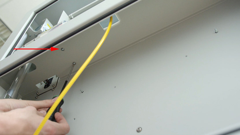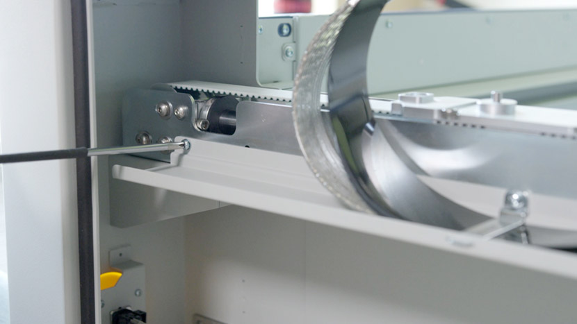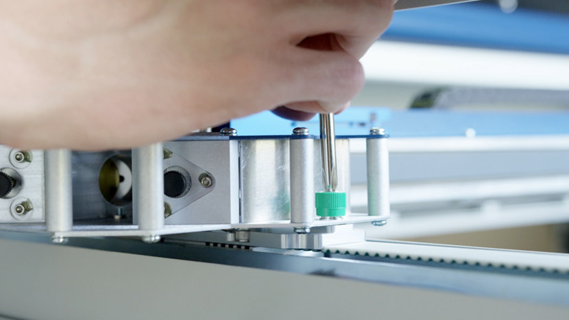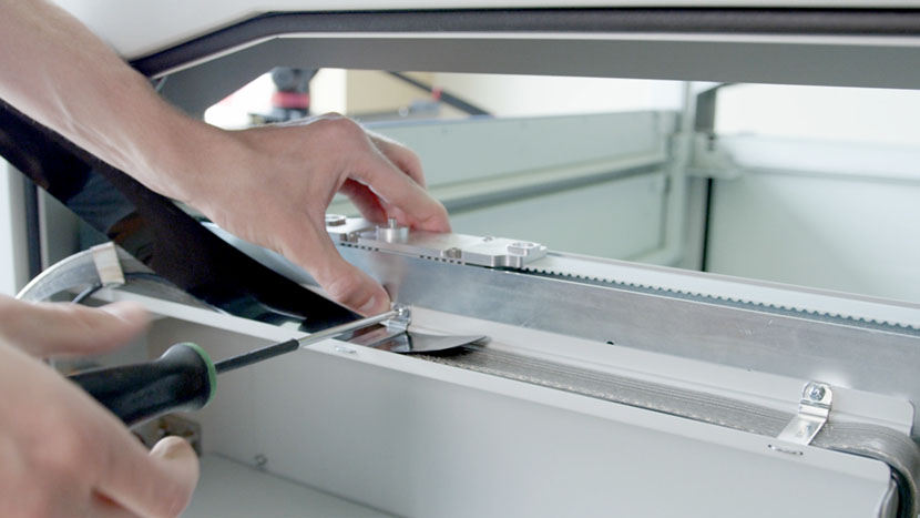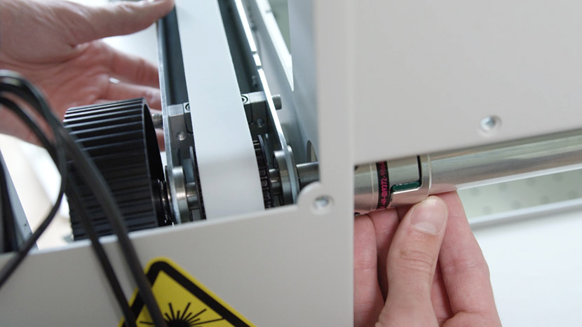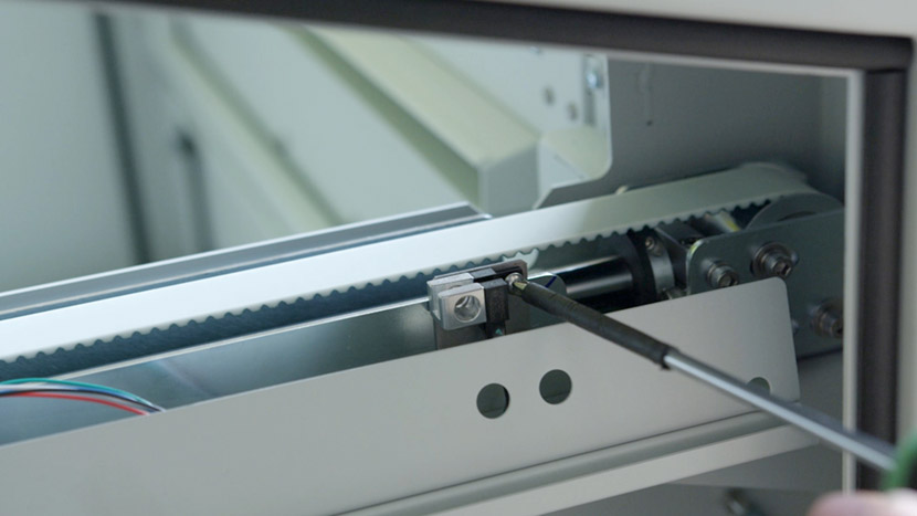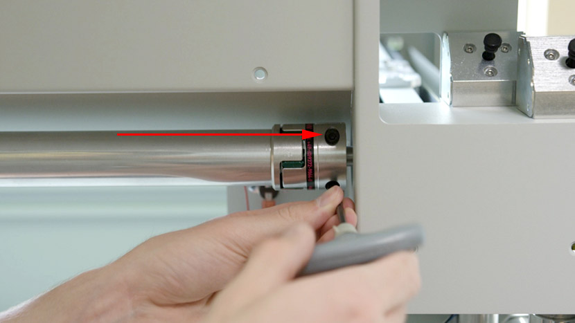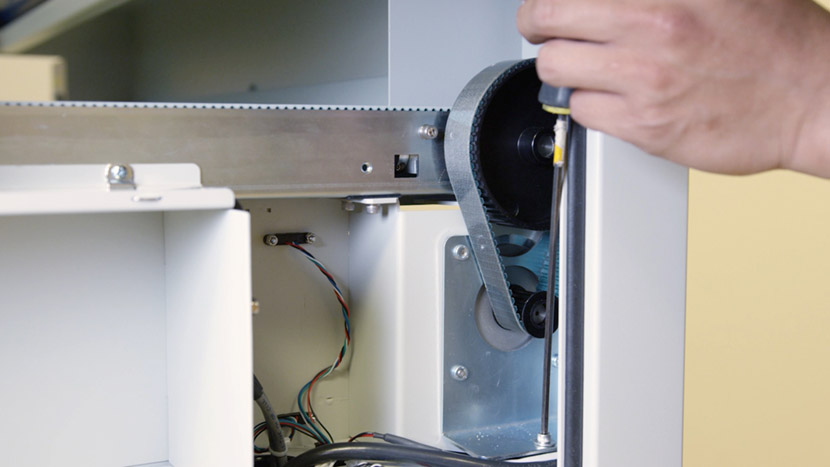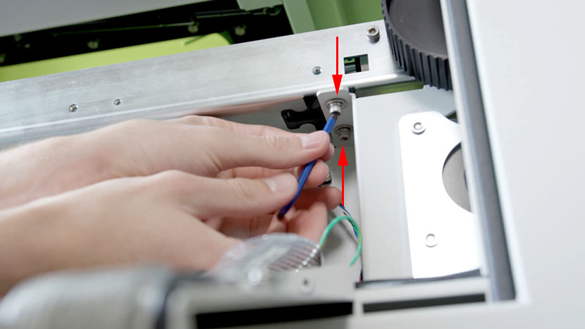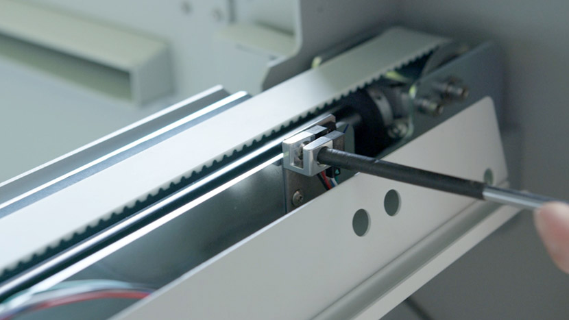 Use a 5/32” hex key to loosen the y-motor tensioning screw. This will loosen the y-axis reducer drive belt.