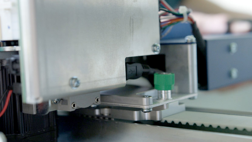 Place the x-axis assembly back onto its mountings and secure it by tightening its 4 green captive screws, lining it up with the guide pins so there is no space between the bottom of the assembly and the screw mounts.