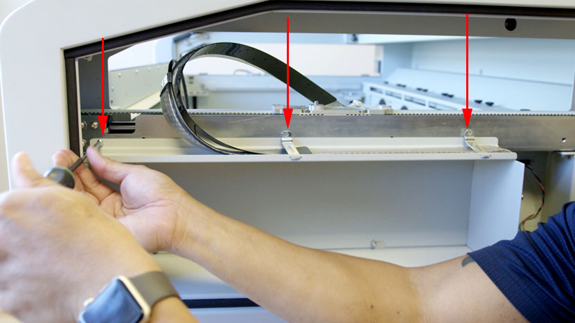 Then remove the two hex screws securing the y-axis to the chassis near the front of the machine.