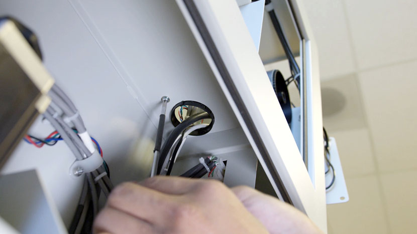 Then use a Philips head screwdriver to insert the 3 screws that connect the compartment panels to the side of the y axis. Two of the screws will also go through and secure the wire harness clamps.
