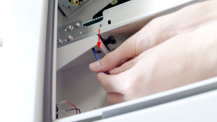 Use a 5/32” hex key to remove the bottom access panel on the left side of the machine.