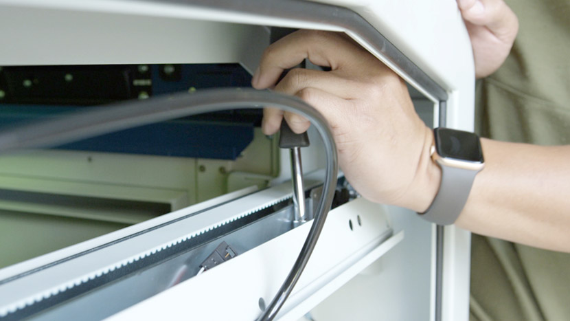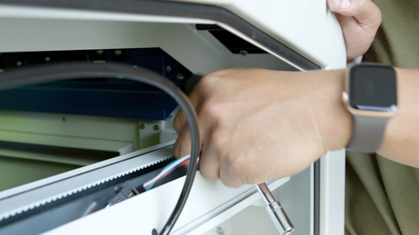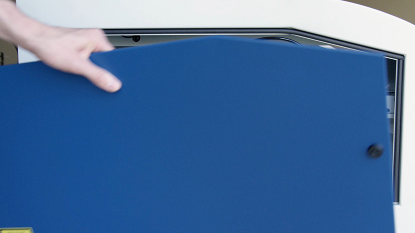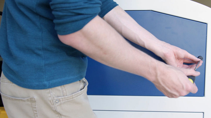 Replace the top access panel on the left side of the machine, using a 5/32” hex key to turn the black panel locks ¾ of the way clockwise.
